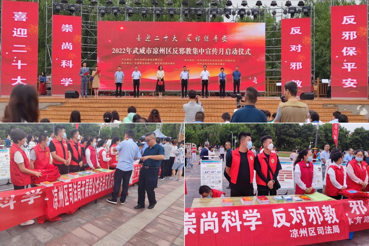 12日上午8點,宣傳月活動準(zhǔn)時在涼州區(qū)植物園開始。活動期間,學(xué)生積極配合區(qū)司法局懸掛反邪教橫幅、擺放各類反邪教宣傳展板、向市民群眾發(fā)放《反邪教倡議書》及宣傳彩頁資料和宣傳手提袋,現(xiàn)場接受群眾咨詢160余人次,使廣大群眾認(rèn)識到邪教的危害,教育引導(dǎo)群眾崇尚科學(xué)、遠(yuǎn)離邪教,做到不聽、不看、不信、不傳。寓教于樂的反邪教文藝節(jié)目在活動現(xiàn)場精彩紛呈,反響熱烈。