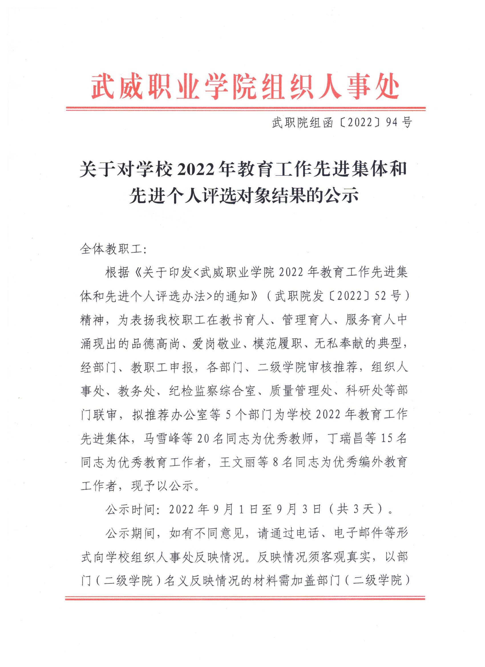 關(guān)于對學(xué)校2022年教育工作先進(jìn)集體和先進(jìn)個人評選對象結(jié)果的公示