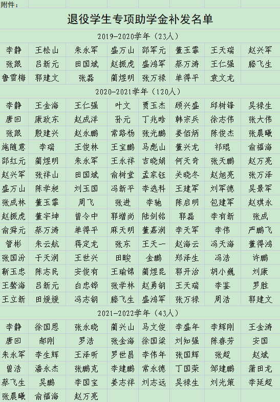 ???? 根據(jù)《甘肅省財政廳 甘肅省教育廳關(guān)于下達 2021年學生資助補助經(jīng)費(第二批)的通知》(甘財教〔2021〕68號)和《甘肅省學生資助資金管理辦法》(甘財教〔2022〕20號)文件要求,學生工作處擬對2019—2020學年符合資助條件的23名退役學生每人補發(fā)助學金3300元,共計75900元;對2020—2021學年符合資助條件的120名退役學生每人補發(fā)助學金3300元,共計396000元;對2021—2022學年符合資助條件的43名退役學生每人補發(fā)助學金3300元,共計141900元?,F(xiàn)向廣大師生進行公示。