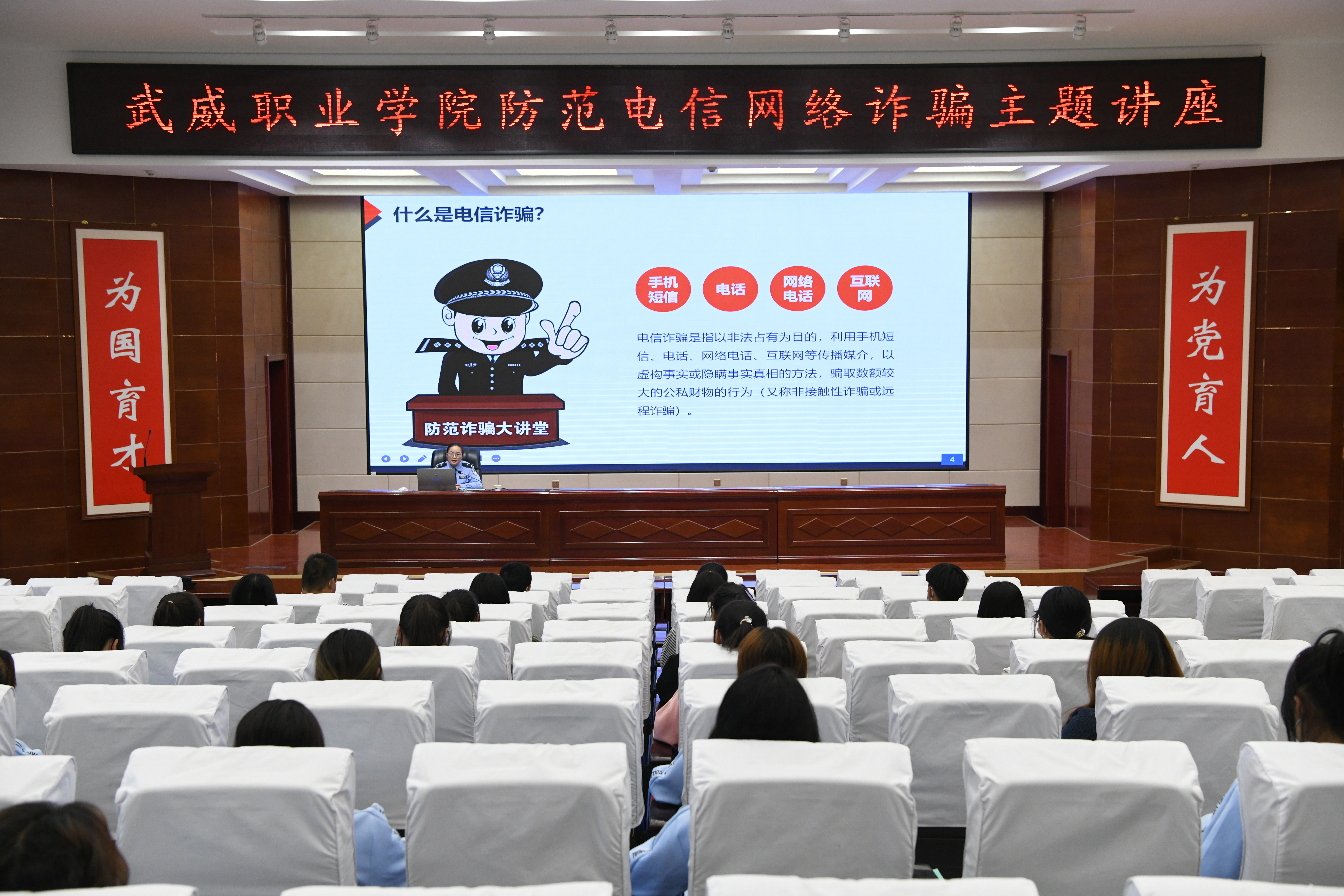 為了提高學校師生識別和防范電信網絡詐騙的能力,切實做好防范電信網絡詐騙宣傳教育工作。9月30日,學校聯(lián)合武威市公安局涼州分局西關派出所在學生發(fā)展中心菁英廳舉辦防范電信網絡詐騙專題講座。各二級學院師生代表聆聽了講座,講座由安全保衛(wèi)處負責人李欣主持。