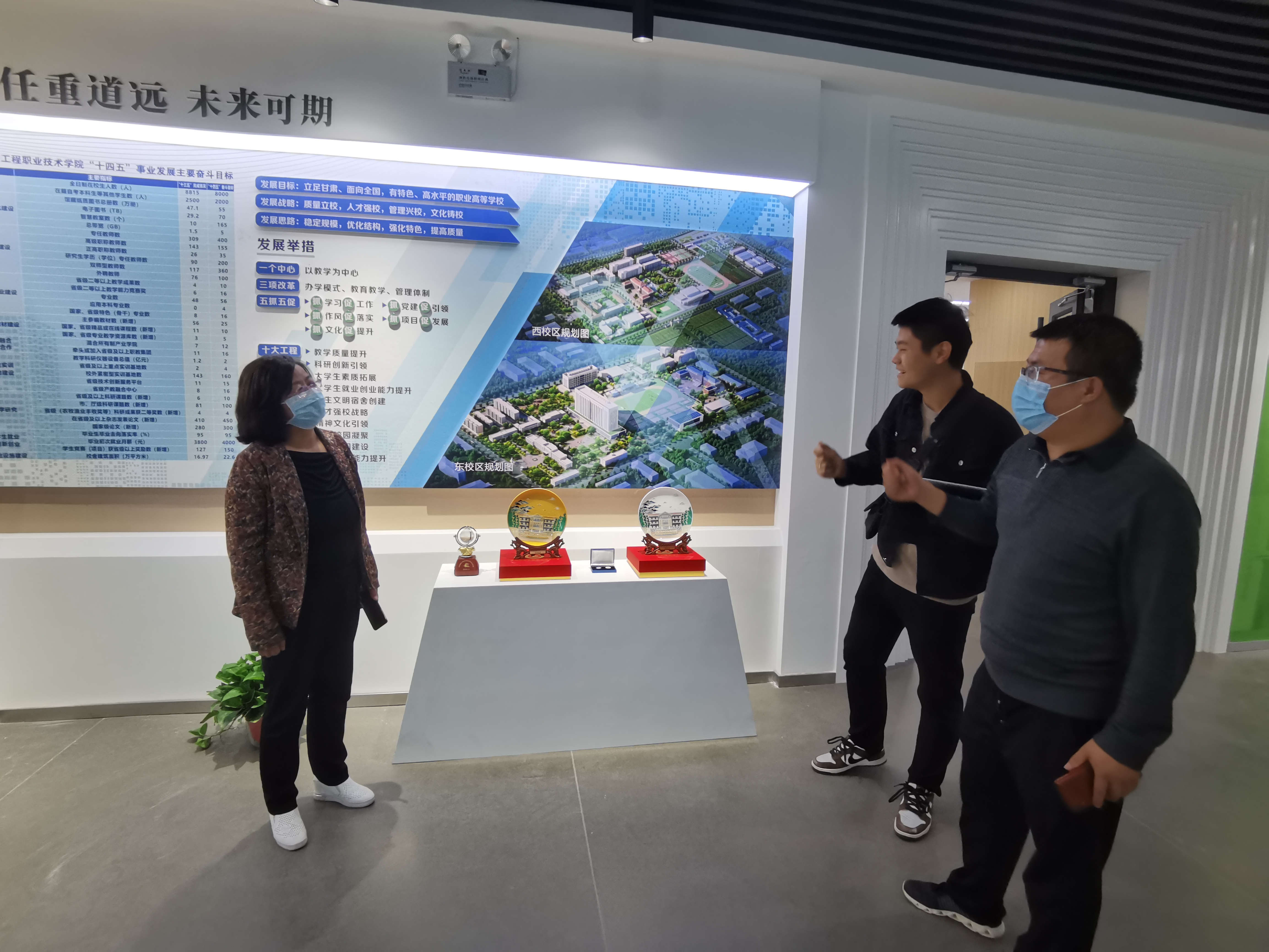 為全面推進“雙高計劃”學校建設,提升圖書館服務水平,營造“書香校園”,將圖書館打造成人性化、智能化、專業(yè)化的綠色學習空間。近日,圖書館館長楊如松、副館長蔡濟眾、館員楊建盛三人到甘肅省畜牧工程職業(yè)技術學院圖書館考察學習,在甘肅省畜牧工程職業(yè)技術學院圖書館館長解玉寶陪同下,參觀了該校圖書館讀書吧、校史館、黨史館、“挑戰(zhàn)杯”獲獎作品展覽館等處,解玉寶講解了該館設計理念及建設過程中的側重點和展示重點。楊如松就現(xiàn)在圖書館裝發(fā)展趨勢、圖書館管理辦法、學生借閱量等實際問題同解玉寶進行了相互交流。