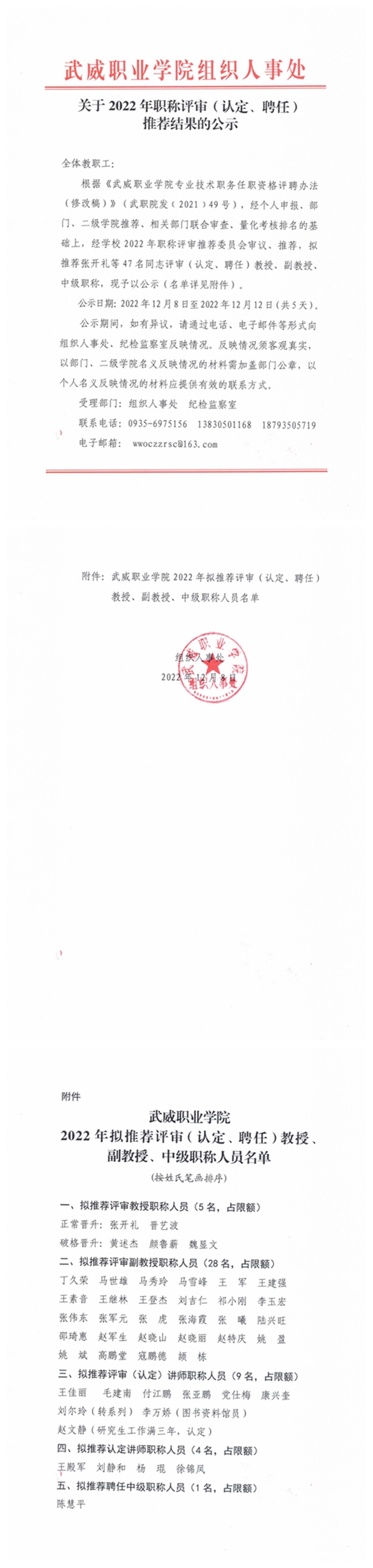 武威職業(yè)學(xué)院關(guān)于2022年教師副教授、講師職稱評審結(jié)果的公示