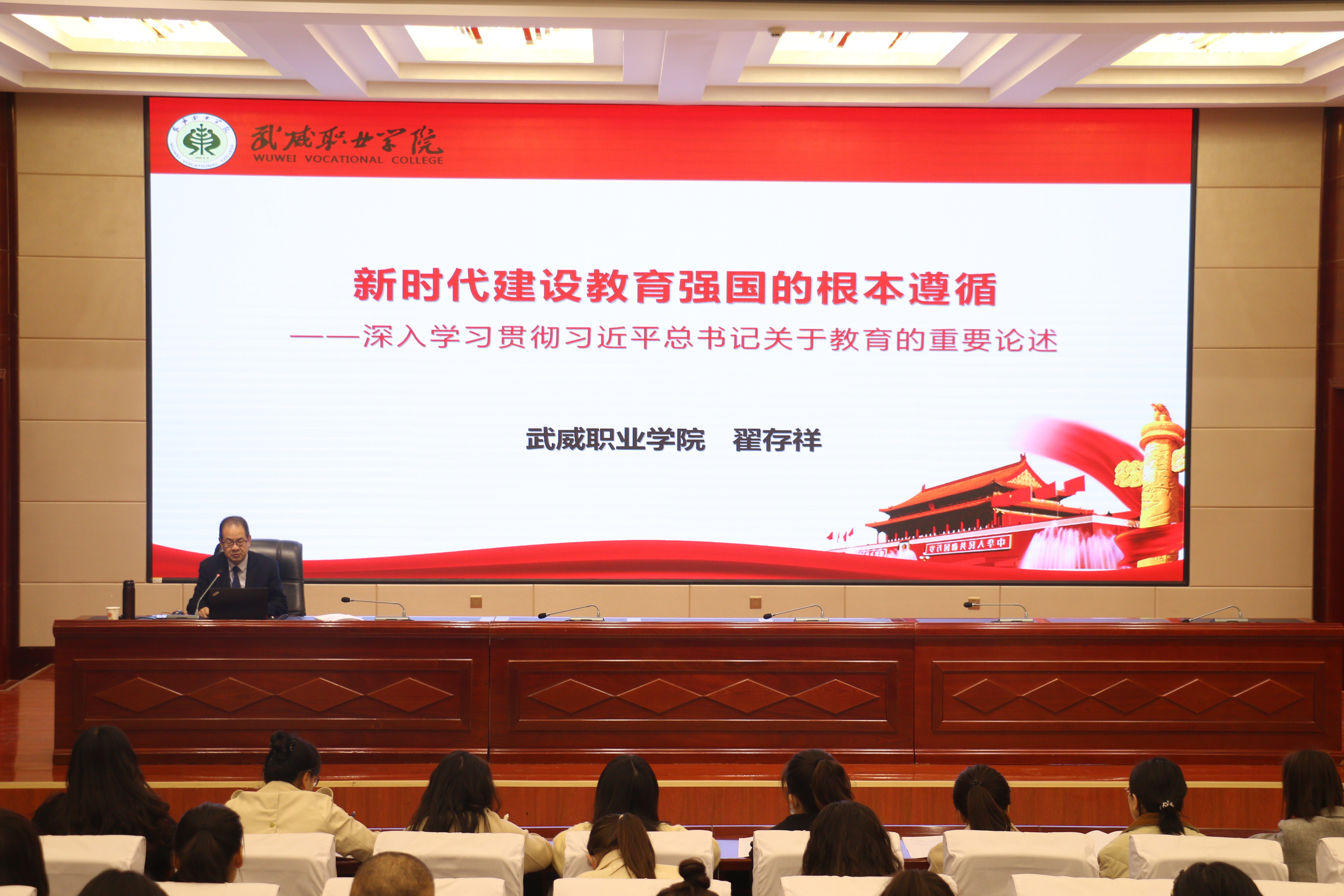 翟存祥代表全體師生對113名新教師成為武威職業(yè)學(xué)院大家庭的一員表示熱烈歡迎,并介紹了舉辦此次培訓(xùn)班的目的。他指出,百年大計,教育為本;教育大計,教師為本;教師大計,師德為本。作為新時代的教師,不要辜負(fù)習(xí)近平總書記“奮斗創(chuàng)造奇跡、力量源于團結(jié)、希望寄予青年”的殷切希望。同時,他要求新教師要搞清楚“我是誰,從哪里來,到哪里去”;搞清楚我要“干什么、如何干、為誰干”。盡快站穩(wěn)三尺講臺,盡快融入職業(yè)教育,盡快融入這個大家庭,盡快成長為一名合格的、優(yōu)秀的人民教師,在教育教學(xué)崗位上立德立功立言。
