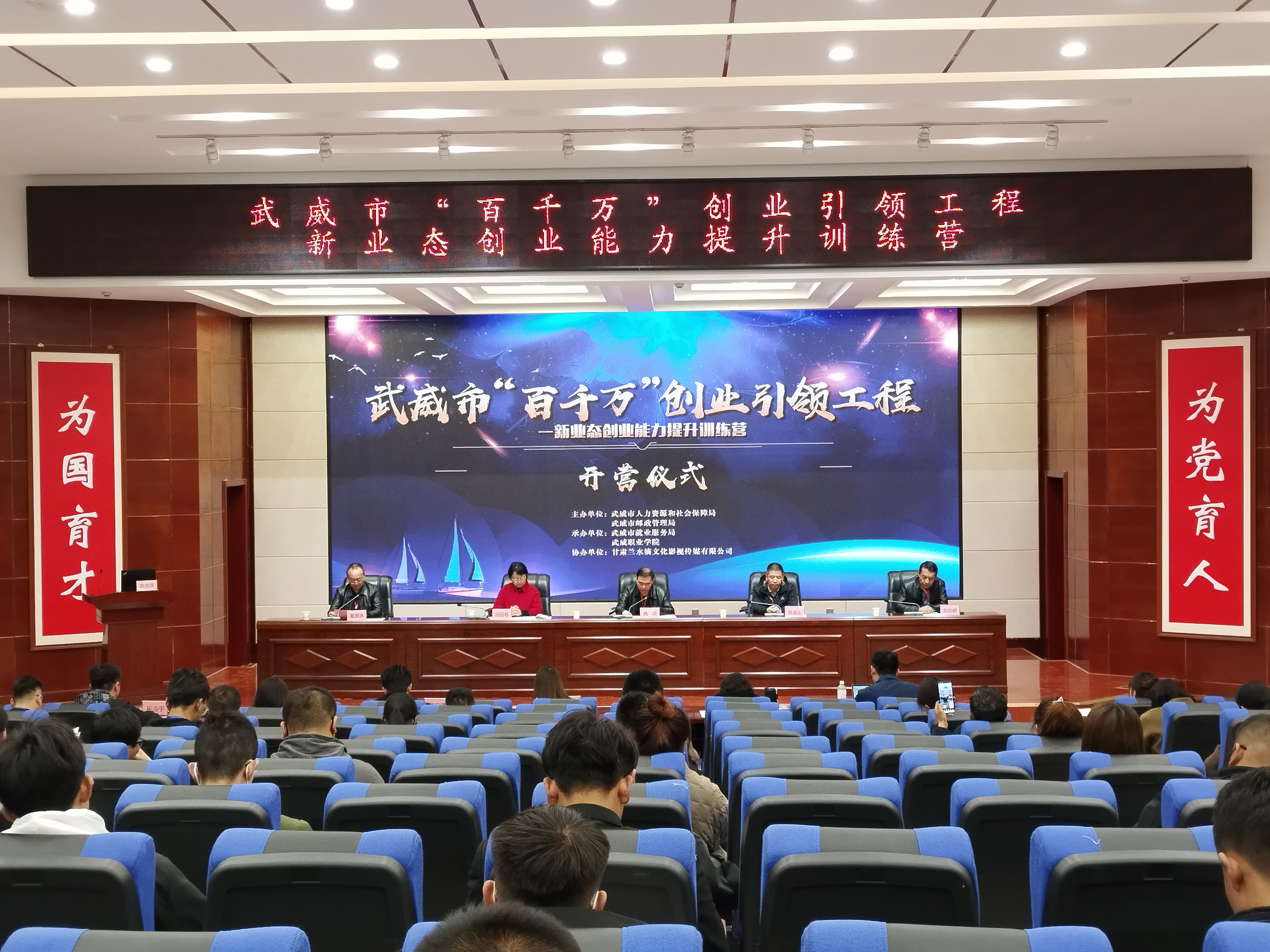 4月6日上午,由我校協(xié)辦的武威市“百千萬”創(chuàng)業(yè)引領工程新業(yè)態(tài)創(chuàng)業(yè)能力提升訓練營在菁英廳舉辦開營儀式,武威市人社局黨組成員、就業(yè)局局長魏斌,武威市郵政管理局黨組成員、副局長張金山,武威市就業(yè)局副局長劉兆順及副校長田迎春出席開營儀式,儀式由市就業(yè)局副局長夏湧濤主持。