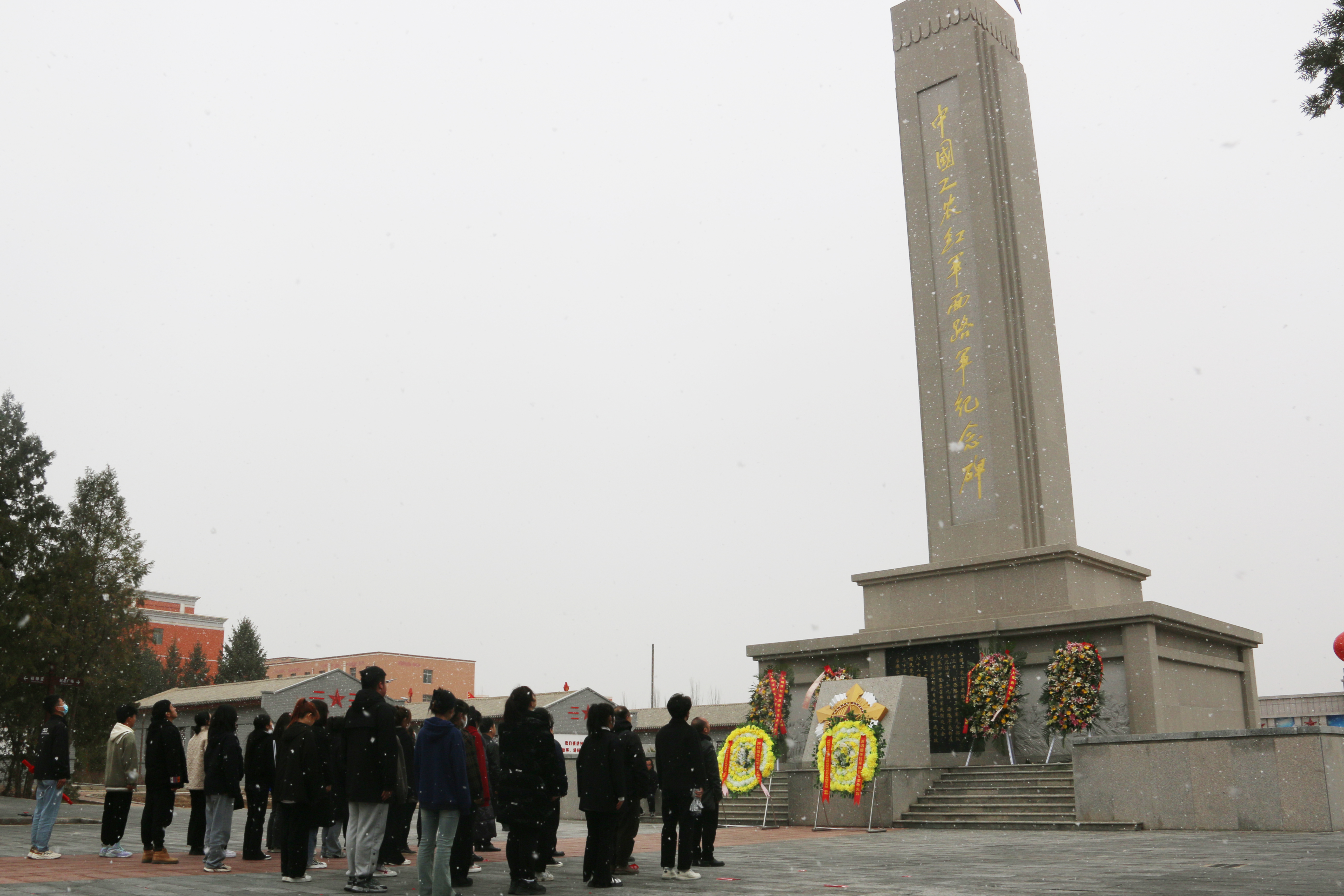 師生在烈士紀念碑前舉行了肅穆的悼念儀式,列隊肅立面對紀念碑鞠躬敬禮并集體默哀,敬獻了花籃,表達了對革命先輩的崇敬之情。