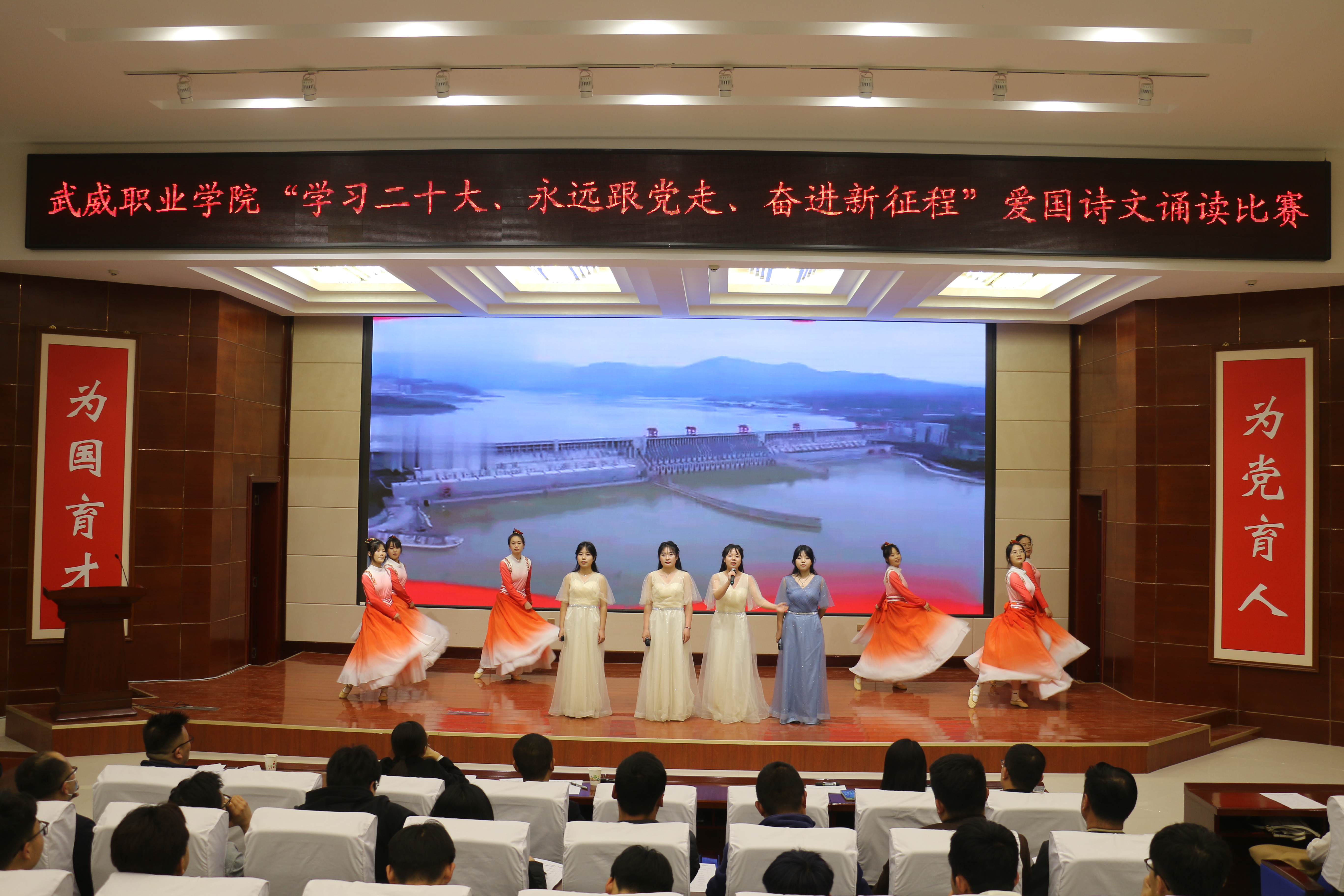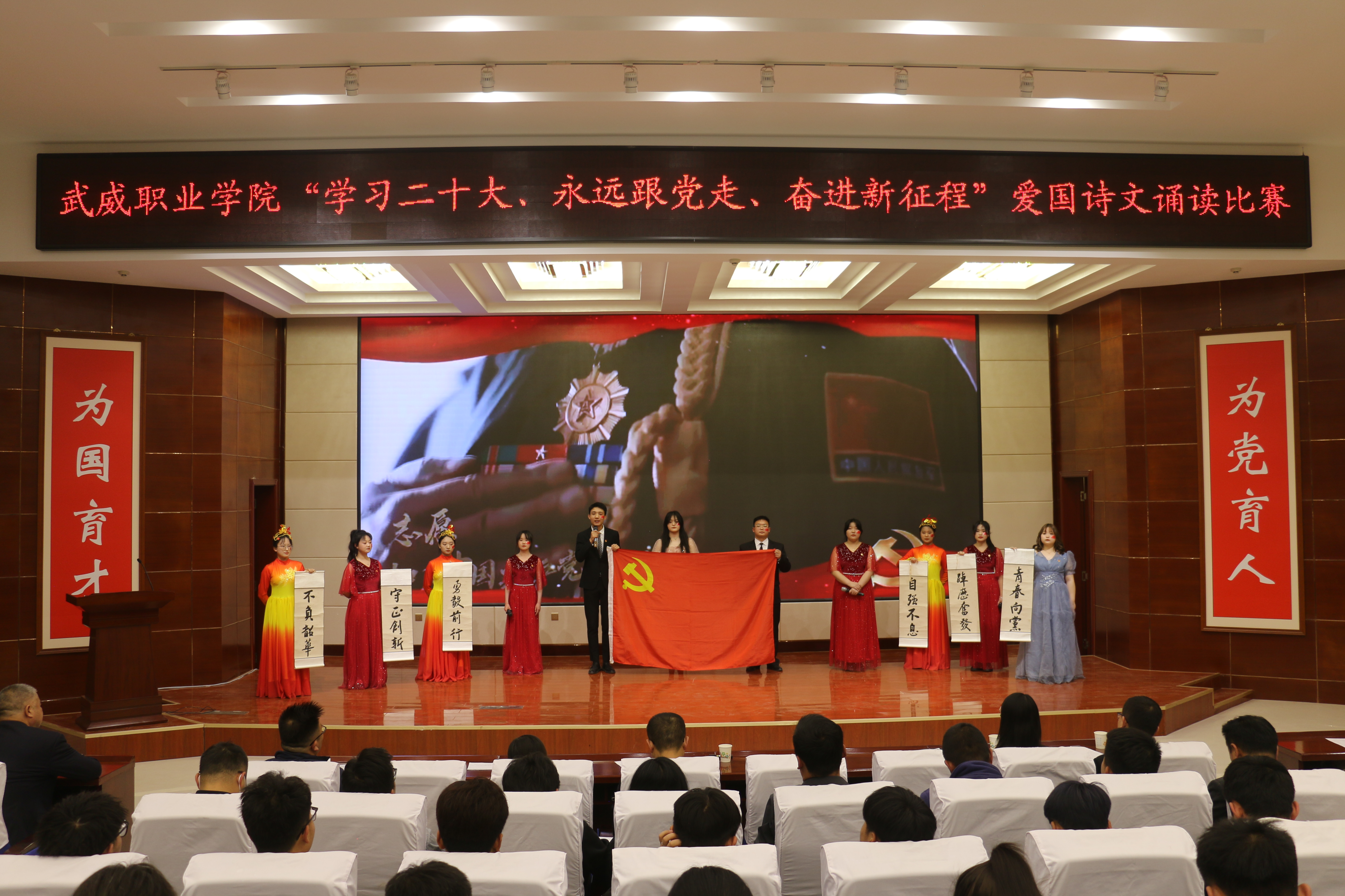 大賽于3月啟動(dòng),歷時(shí)一個(gè)月,各二級學(xué)院經(jīng)過初賽評比推選出9個(gè)優(yōu)秀節(jié)目入圍決賽。比賽現(xiàn)場,各參賽隊(duì)以“學(xué)習(xí)二十大、永遠(yuǎn)跟黨走、奮進(jìn)新征程”為主題,將傳承經(jīng)典詩文和弘揚(yáng)愛國主義精神結(jié)合,誦詩抒情、借詞言志,熱情謳歌中國共產(chǎn)黨不懈奮斗的光輝歷程,全面展現(xiàn)新時(shí)代青年以夢為馬,不負(fù)韶華的青春風(fēng)貌。校團(tuán)委原創(chuàng)編排表演的節(jié)目《追夢八步沙,奮斗正青春》,深情動(dòng)人,感染全場,歌頌了“六老漢”矢志艱苦奮斗的隴人品格,抒發(fā)了當(dāng)代青年永跟黨走,青春建功的豪情壯志。富余藝術(shù)感染力的經(jīng)典吟誦,穿插舞蹈、劇情和紅歌演唱,為廣大師生呈現(xiàn)了一場視聽盛宴。