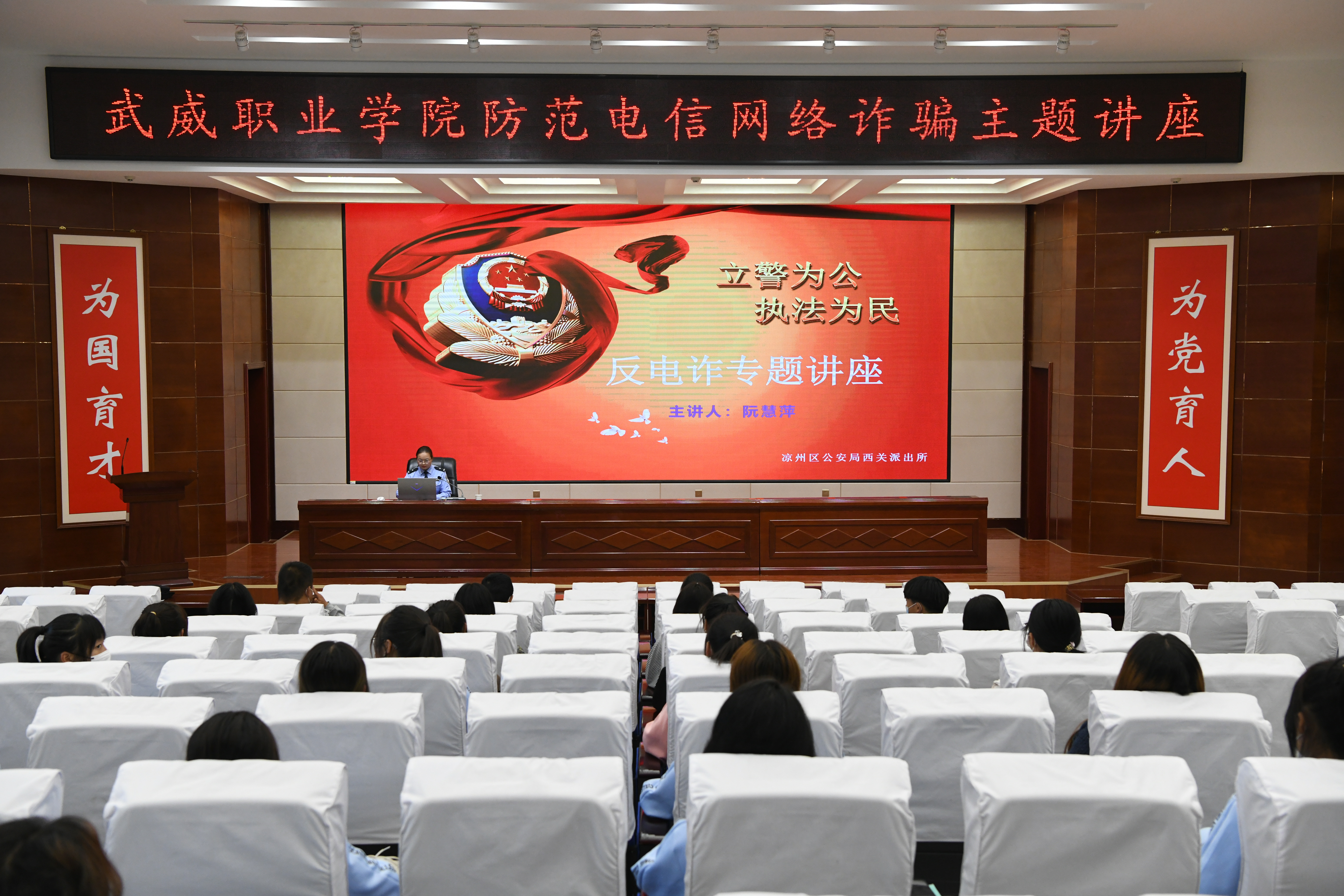 為了提高學(xué)校師生識別和防范電信網(wǎng)絡(luò)詐騙的能力,切實做好防范電信網(wǎng)絡(luò)詐騙宣傳教育工作。9月30日,學(xué)校聯(lián)合武威市公安局涼州分局西關(guān)派出所在學(xué)生發(fā)展中心菁英廳舉辦防范電信網(wǎng)絡(luò)詐騙專題講座。各二級學(xué)院師生代表聆聽了講座,講座由安全保衛(wèi)處負(fù)責(zé)人李欣主持。