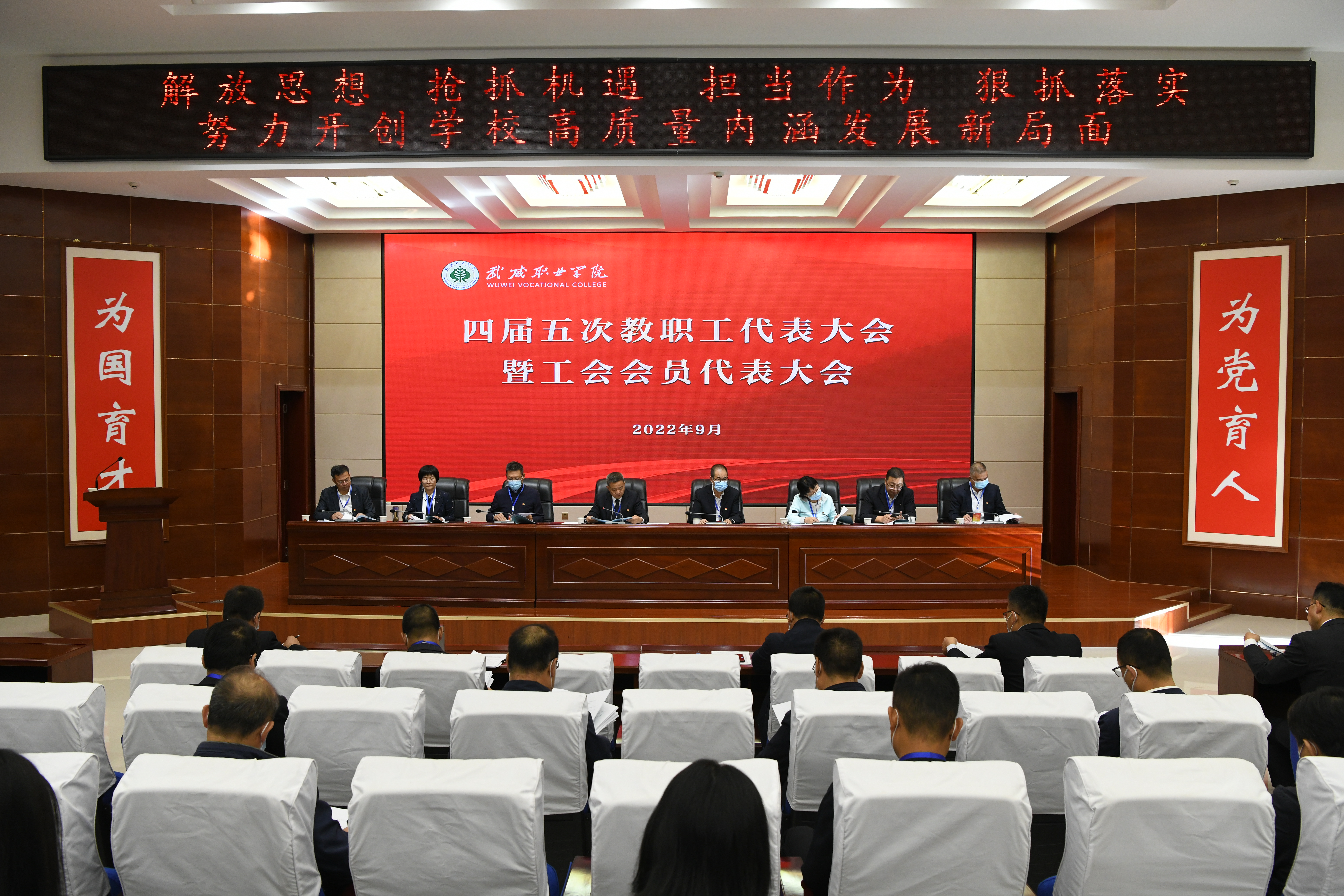 大會在雄壯的國歌聲中開幕,黨委書記、校長趙明作了題為《解放思想 搶抓機(jī)遇 擔(dān)當(dāng)作為 狠抓落實(shí) 努力開創(chuàng)學(xué)校高質(zhì)量發(fā)展新局面》的工作報(bào)告,系統(tǒng)回顧了四屆四次教職工(會員)代表大會以來學(xué)校事業(yè)發(fā)展所取得的顯著成績,分析了學(xué)校當(dāng)前面臨的形勢與存在的問題,明確了今后工作思路和主要工作舉措。副校長張開禮作了關(guān)于修訂《武威職業(yè)學(xué)院章程》的情況說明。大會以書面形式審議了《學(xué)校財(cái)務(wù)工作報(bào)告》《工會工作報(bào)告》《工會經(jīng)費(fèi)審查報(bào)告》。
