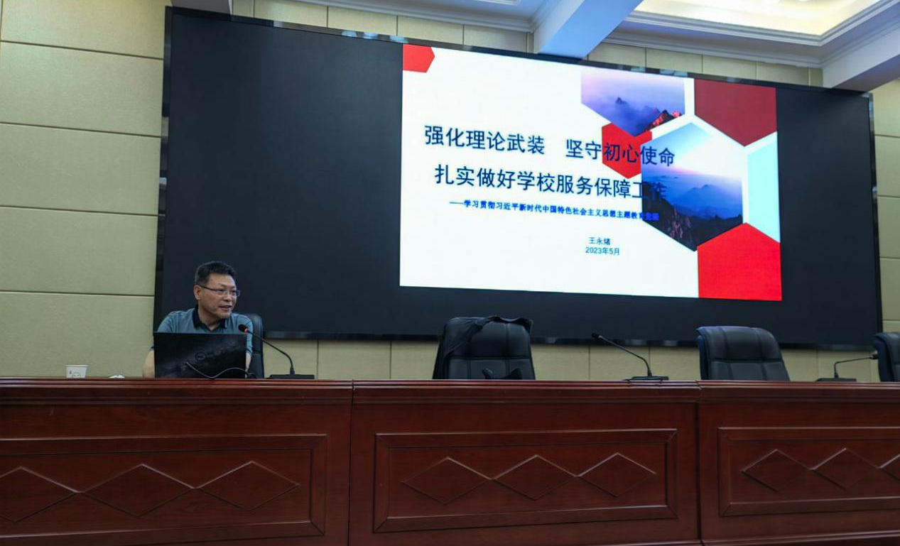 5月30日,學(xué)校黨委委員、副校長王永緒以《強(qiáng)化理論武裝?堅(jiān)守初心使命——扎實(shí)做好學(xué)校服務(wù)保障工作》為題,在學(xué)校行樹樓北側(cè)學(xué)術(shù)報(bào)告廳講授學(xué)習(xí)貫徹習(xí)近平新時(shí)代中國特色社會(huì)主義思想主題教育專題黨課。后勤管理處黨員、干部職工參加黨課學(xué)習(xí)。