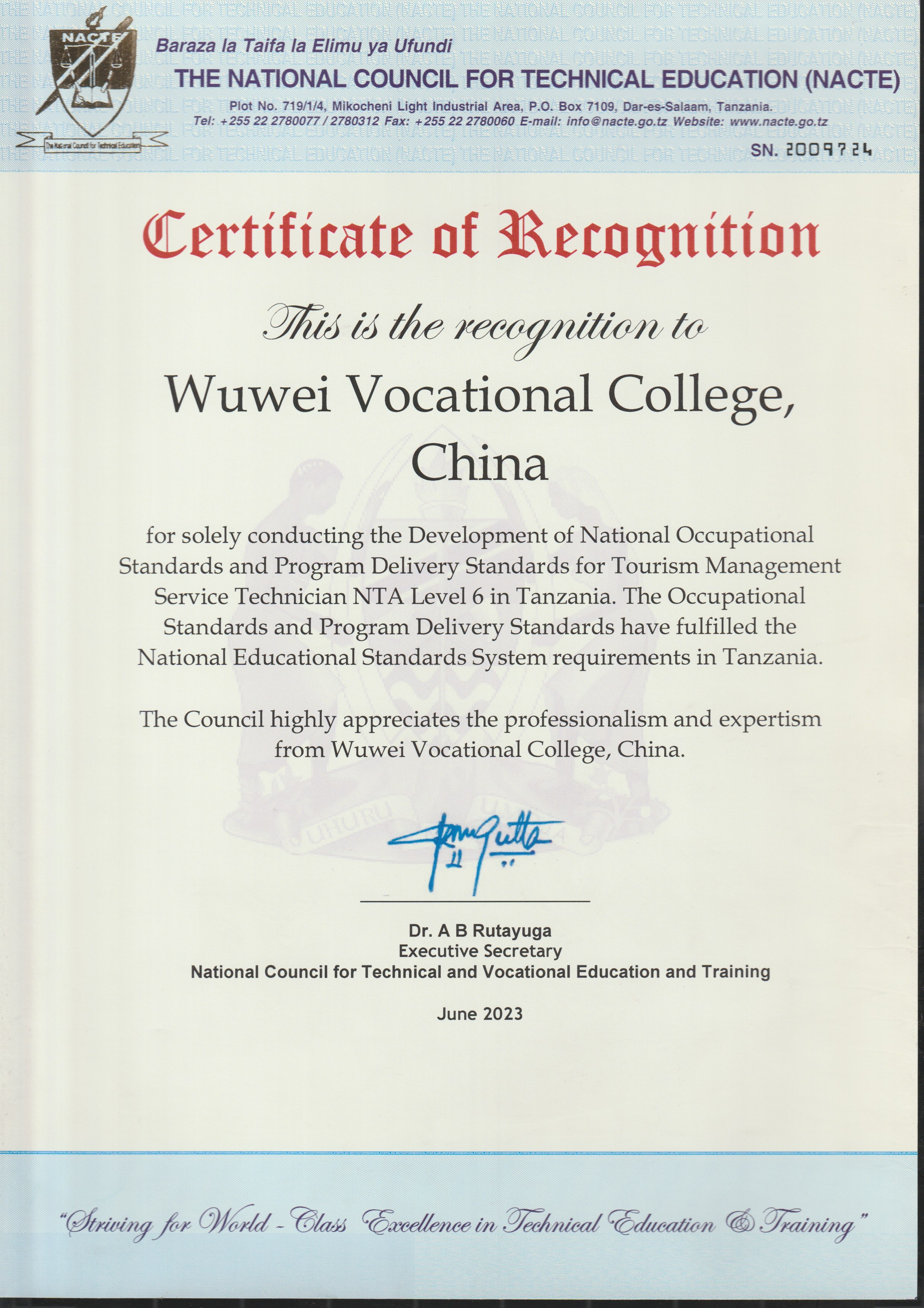 6月16日,學(xué)校獨(dú)立開(kāi)發(fā)制定的旅游管理服務(wù)技術(shù)員6級(jí)職業(yè)標(biāo)準(zhǔn)和配套專業(yè)教學(xué)標(biāo)準(zhǔn)通過(guò)了坦桑尼亞國(guó)家職業(yè)教育委員會(huì)審核,獲得認(rèn)證,正式納入坦桑尼亞國(guó)家職業(yè)教育體系。旅游管理服務(wù)技術(shù)員6級(jí)職業(yè)標(biāo)準(zhǔn)和配套專業(yè)教學(xué)標(biāo)準(zhǔn)由學(xué)校經(jīng)濟(jì)管理學(xué)院旅游管理專業(yè)教師許春華、占發(fā)禹、張語(yǔ)悅、王美婕、閆亞旗、劉金萍六位教師共同開(kāi)發(fā)制定。