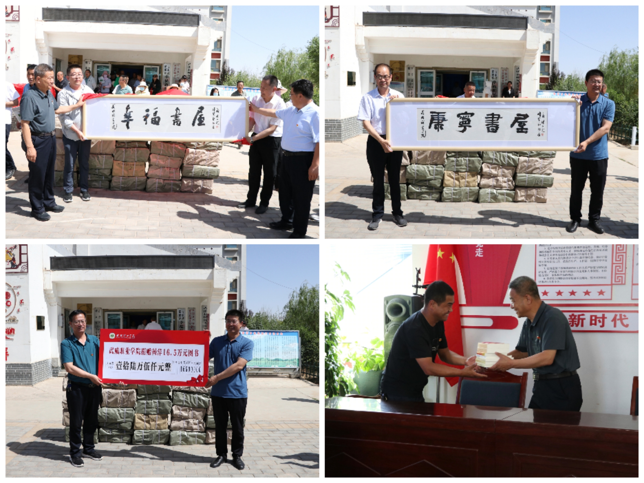 趙明、何文國就文化振興項(xiàng)目進(jìn)行了深入交流,簽訂了《定向幫扶捐贈(zèng)協(xié)議》《武威職業(yè)學(xué)院在橫梁鄉(xiāng)幸福新村、康寧新村捐建開放式農(nóng)家書屋的協(xié)議書》,雙方代表為幸福書屋、康寧書屋揭牌,學(xué)校為橫梁鄉(xiāng)捐贈(zèng)文化振興專項(xiàng)資金13萬元和碼洋16.5萬元的圖書。