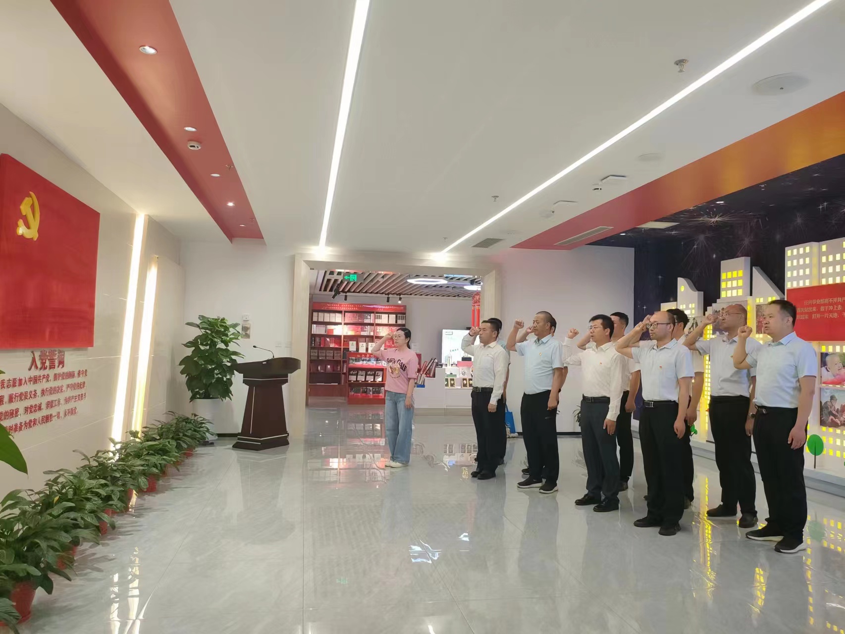 參觀結束后,在鮮紅的黨旗下,全體黨員舉起右拳,重溫入黨誓詞。一句句鏗鏘的誓言、一個個緊握的拳頭、一枚枚閃亮的黨徽,深情表達著對黨的無限熱愛和聽黨話、感黨恩的決心。