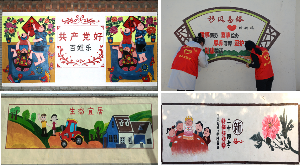 自2019 年以來,武威職業(yè)學院堅持“立足地方、融入地方、服務地方”的發(fā)展理念,將優(yōu)勢學科專業(yè)與武威市經(jīng)濟社會發(fā)展緊密結合,組織師生開展“打造人文美居助力鄉(xiāng)村振興”墻體彩繪志愿服務項目,通過墻體彩繪反映黨的領導下農(nóng)村精神風貌的變化和取得的成就,將村莊重點街巷屋面墻體繪制出一幅幅反映美麗鄉(xiāng)村建設、社會主義核心價值觀、移風易俗、鄉(xiāng)風文明等為主題的墻體畫,形象生動、 通俗易懂的內(nèi)容讓村民變“被動學”為“主動看”,不僅展現(xiàn)了農(nóng)村新生活、農(nóng)業(yè)新氣象、農(nóng)民新面貌,美化了村容村貌,為美麗鄉(xiāng)村建設、人居環(huán)境美化添磚加瓦。