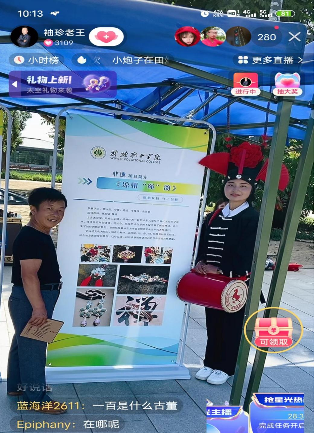 實(shí)踐團(tuán)在雷臺景區(qū)開展了涼州攻鼓子的展演活動(dòng),團(tuán)員們身著黑夸衣,頭戴黑幞帽,在炎炎夏日里向過往游客展示攻鼓子的魅力,過往游客深感震撼。此外,實(shí)踐團(tuán)成員通過文化展架以及文創(chuàng)產(chǎn)品的形式展示武威非遺文化,并邀請網(wǎng)絡(luò)達(dá)人以現(xiàn)場直播的形式擴(kuò)大宣傳范圍,以新媒體的形式讓更多的人關(guān)注武威非遺文化。通過現(xiàn)場展演以及新媒體宣傳,創(chuàng)新“活”的交流模式,在弦歌不輟、思接千載的傳承中,非遺文化的芬芳愈加醇厚。
