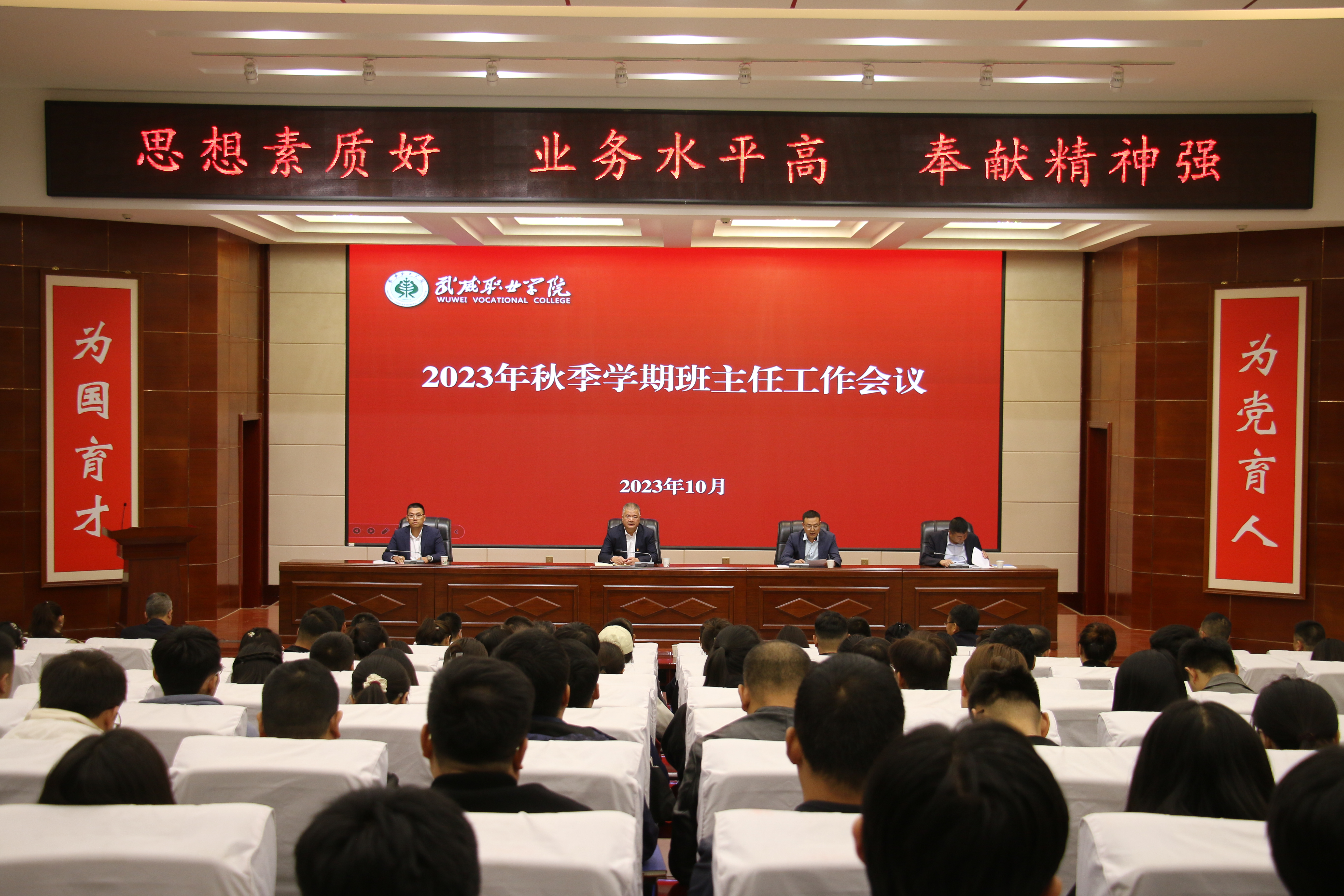 會議上,高鵬堂領(lǐng)學(xué)了《武威職業(yè)學(xué)院班主任工作實施辦法》《武威職業(yè)學(xué)院班主任工作考核辦法》等制度文件,結(jié)合具體工作提出要求;招生就業(yè)處負(fù)責(zé)人董鵬、安全保衛(wèi)處負(fù)責(zé)人李欣就班主任相關(guān)工作進(jìn)行了說明和要求;中科低碳新能源技術(shù)學(xué)院負(fù)責(zé)人胡建宏針對班導(dǎo)師工作進(jìn)行了交流發(fā)言,護(hù)理學(xué)院黨總支書記張建輝針對班主任管理工作進(jìn)行了交流發(fā)言,武威市優(yōu)秀班主任獲得者、經(jīng)濟(jì)管理學(xué)院教師姚盈就班主任工作經(jīng)驗和心得進(jìn)行了交流發(fā)言。