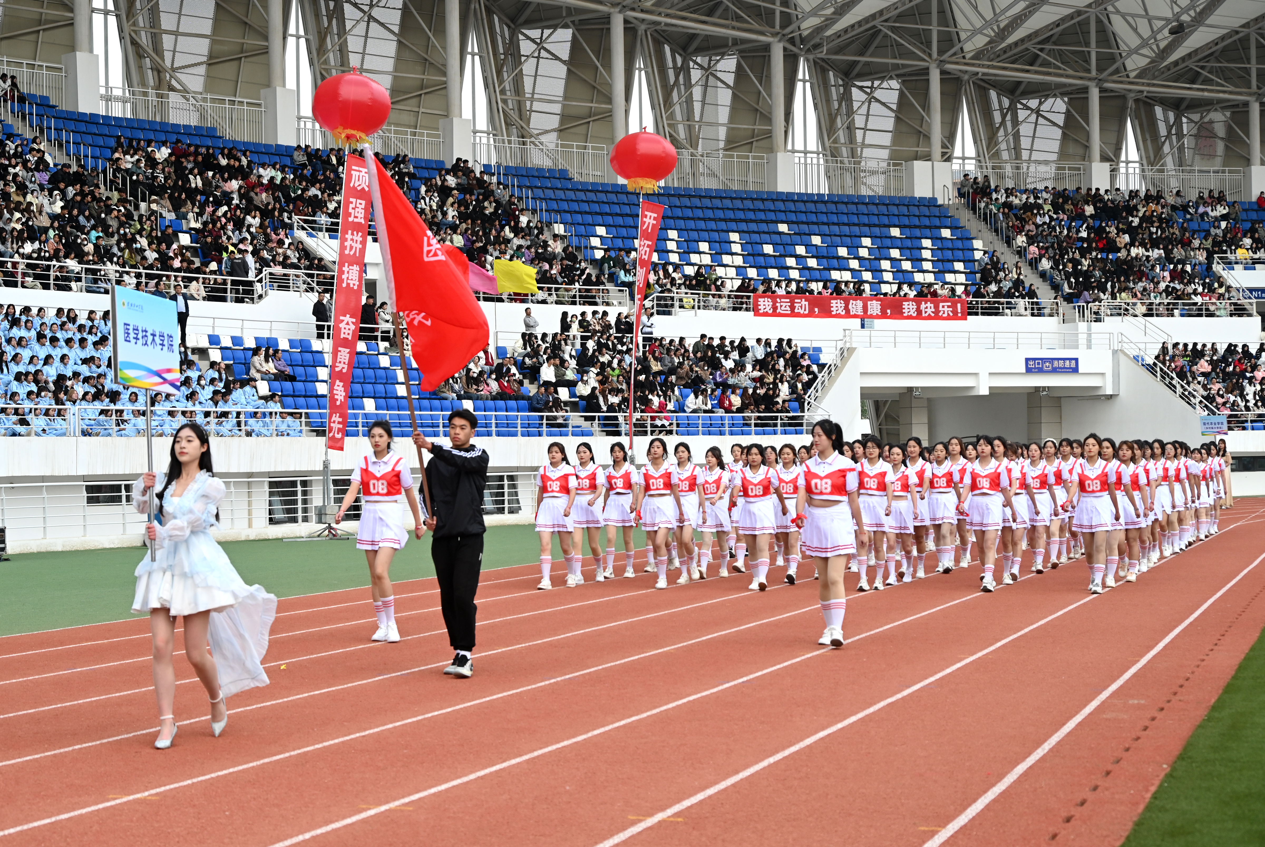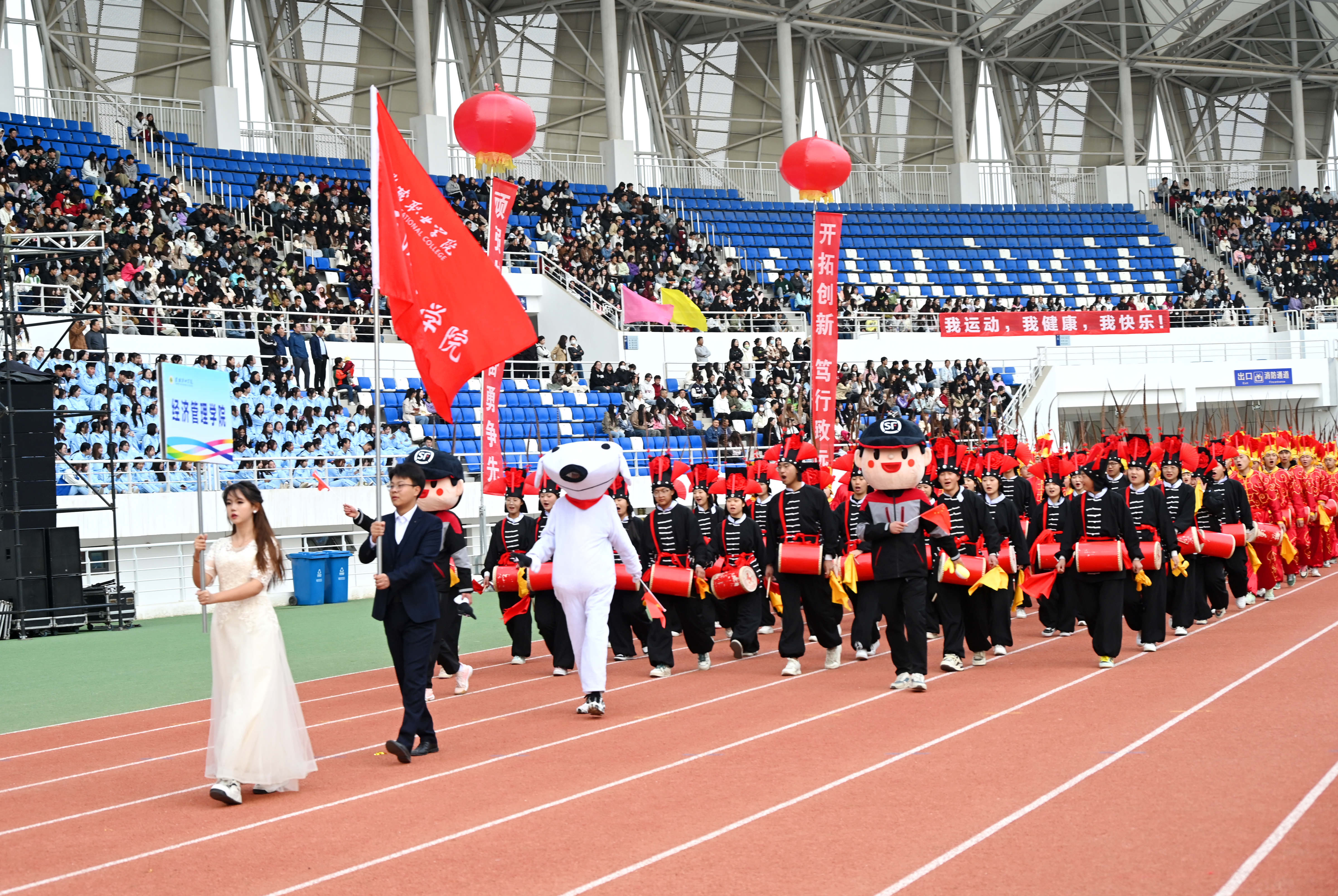 伴隨著雄壯激越的運(yùn)動(dòng)員進(jìn)行曲,國(guó)旗護(hù)衛(wèi)隊(duì)、彩旗隊(duì)、裁判員隊(duì)伍、各二級(jí)學(xué)院方陣依次入場(chǎng),隊(duì)列步伐整齊有力,口號(hào)堅(jiān)定嘹亮,充分展示了師生良好的精神風(fēng)貌。