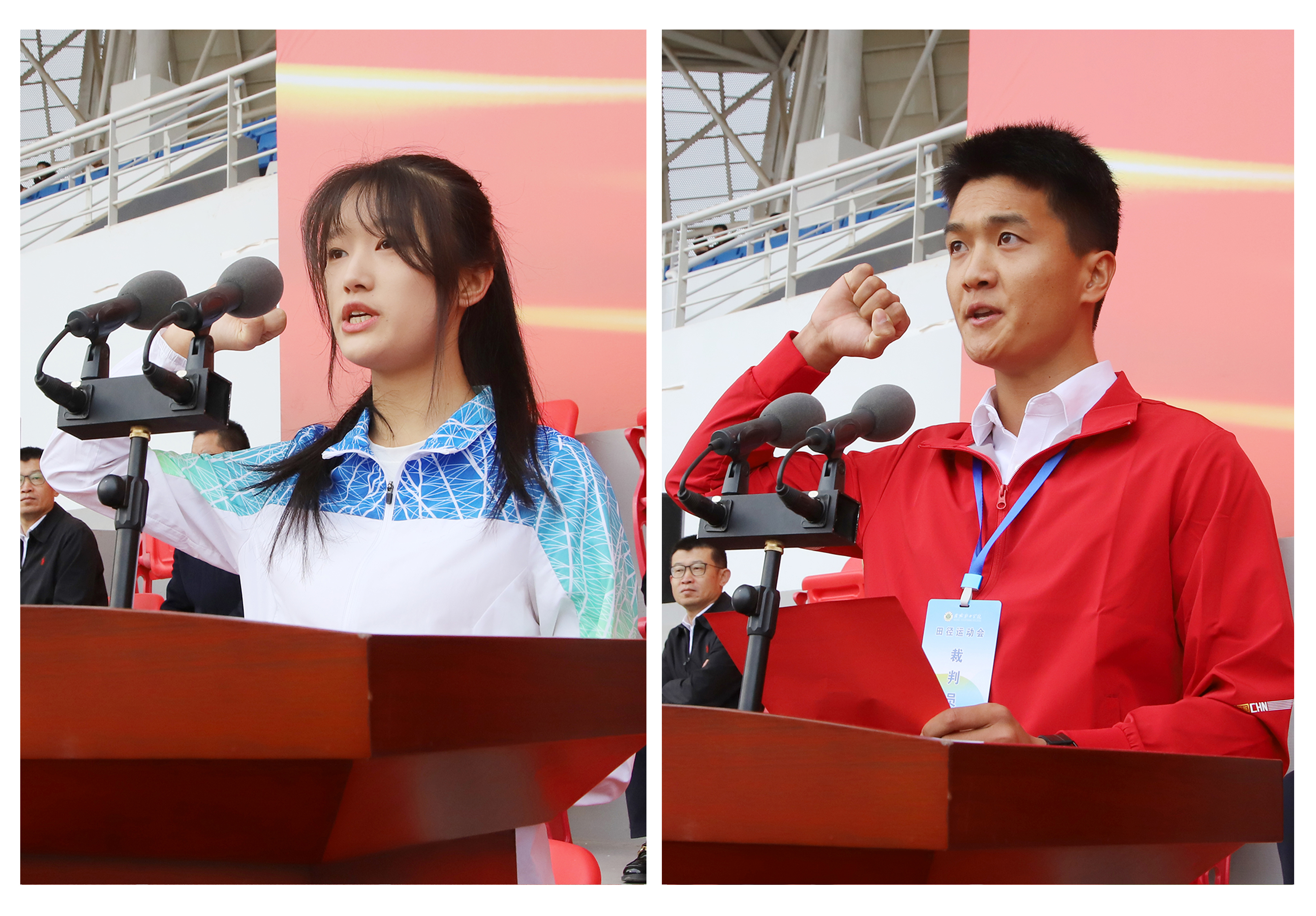 開(kāi)幕式上,侯昊燁同學(xué)和吳績(jī)?nèi)鹄蠋煼謩e代表運(yùn)動(dòng)員和裁判員進(jìn)行了莊嚴(yán)的宣誓。