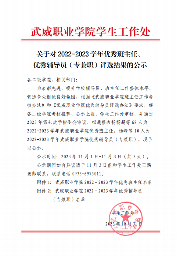 關于對2022-2023學年優(yōu)秀班主任、優(yōu)秀輔導員(專兼職)評選結果的公示