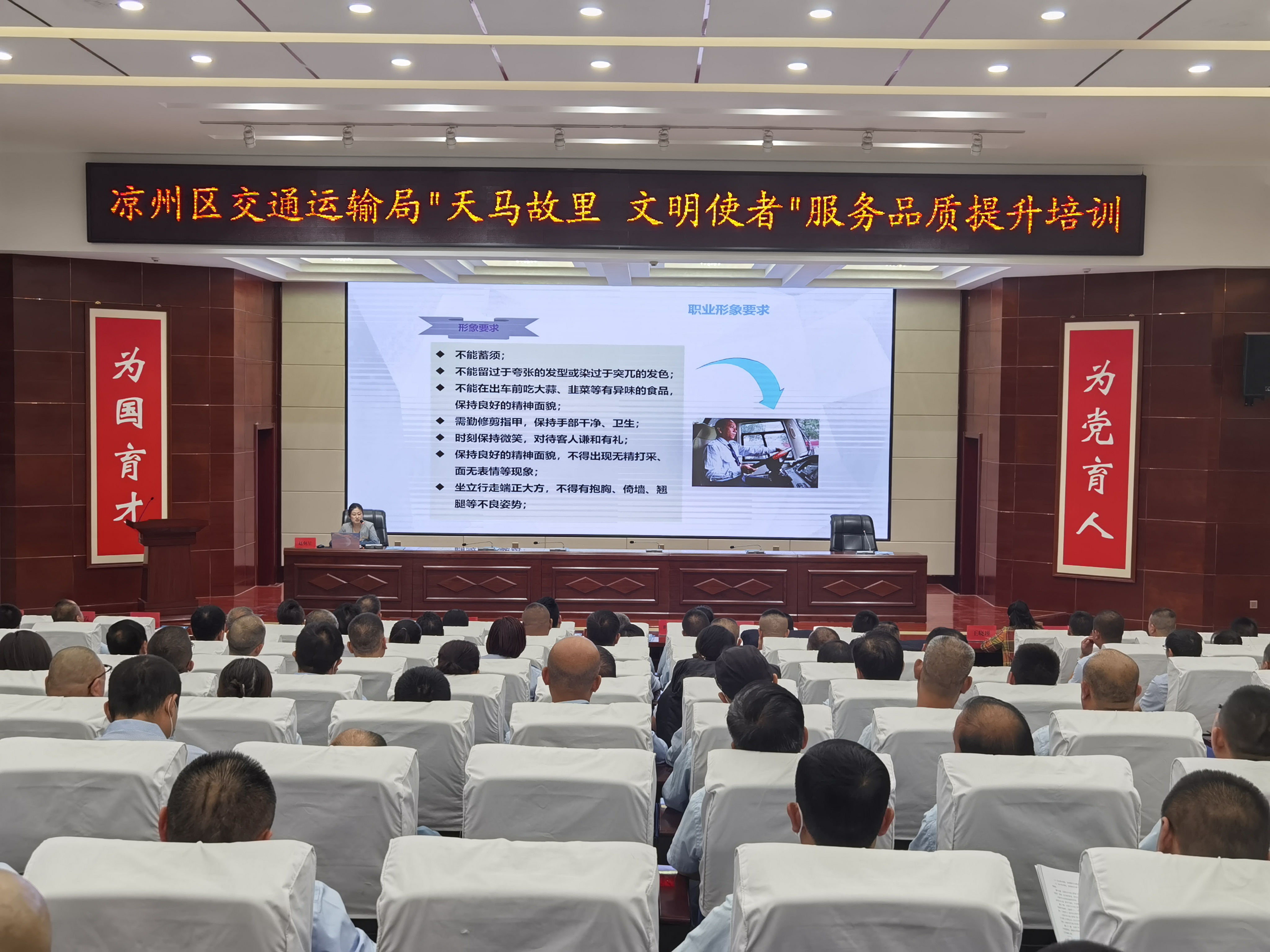 6月28日,“天馬故里 文明使者”客運(yùn)企業(yè)從業(yè)人員服務(wù)品質(zhì)提升培訓(xùn)班在武威職業(yè)學(xué)院開班。市交通局副局長(zhǎng)柴天祥,區(qū)委常委、統(tǒng)戰(zhàn)部部長(zhǎng)、區(qū)政協(xié)黨組書記許娜,市交通運(yùn)輸綜合行政執(zhí)法隊(duì)隊(duì)長(zhǎng)韓世泰,市運(yùn)管局副局長(zhǎng)許培明,學(xué)校黨委委員、副校長(zhǎng)王守云出席開班儀式。開班式由涼州區(qū)交通運(yùn)輸局副局長(zhǎng)蘇銀堂主持,出租客運(yùn)公司、城市公交公司和定制客運(yùn)公司管理人員及從業(yè)人員220人參加開班儀式。