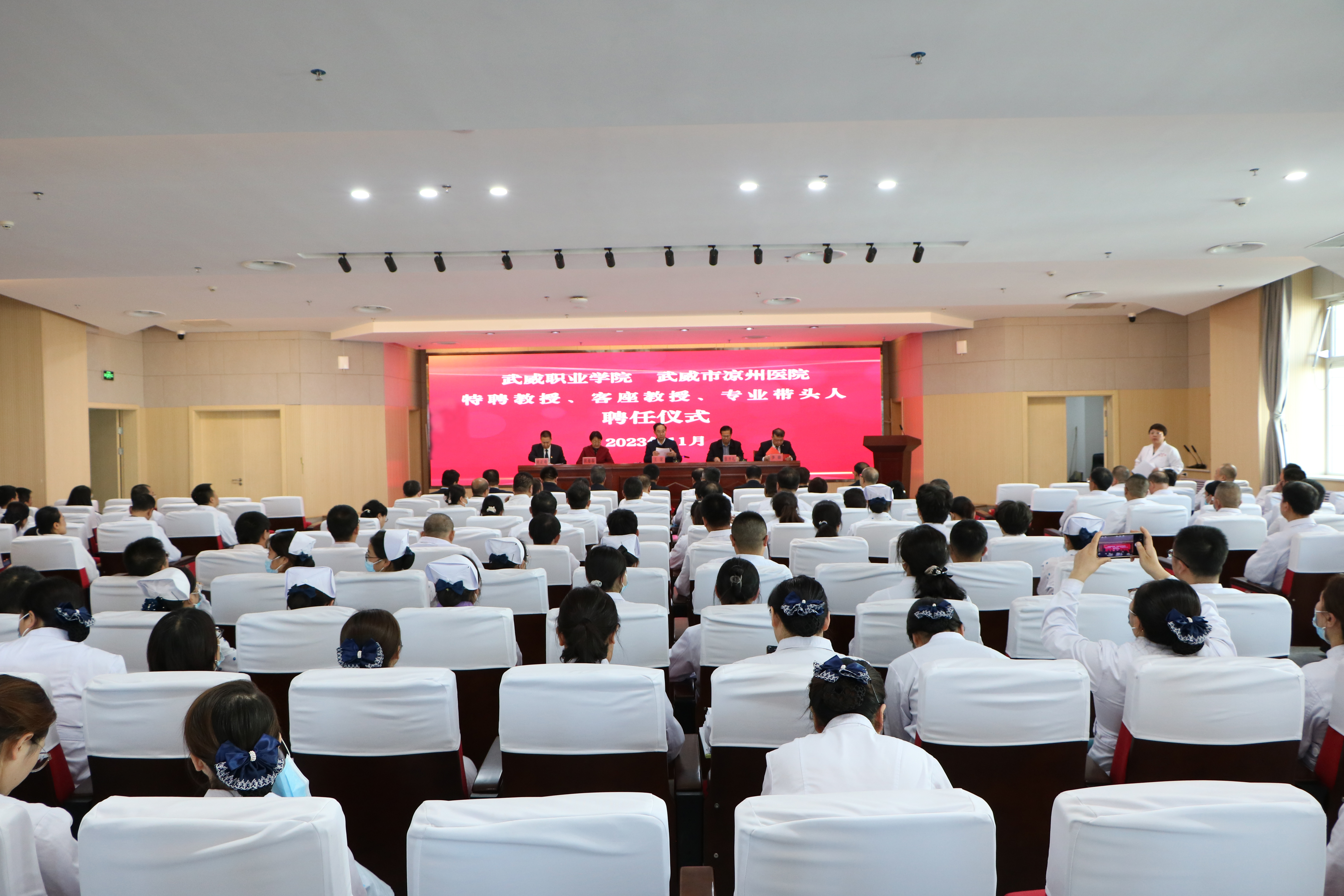 武威職業(yè)學(xué)院相關(guān)部門(mén)、二級(jí)學(xué)院負(fù)責(zé)人,涼州醫(yī)院相關(guān)部門(mén)負(fù)責(zé)人和醫(yī)護(hù)人員代表共320余人參加了聘任儀式。