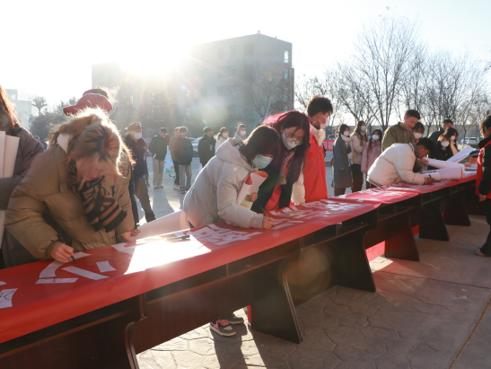 防艾知識(shí)宣傳志愿隊(duì)伍在大學(xué)生活動(dòng)中心廣場(chǎng)發(fā)放宣傳手冊(cè),制作并贈(zèng)送紅絲帶標(biāo)志400余個(gè),活動(dòng)中對(duì)300余名學(xué)生進(jìn)行了免費(fèi)艾滋病檢測(cè)。同學(xué)們一同在宣傳條幅上簽名,祝福語(yǔ)書滿了紅絲帶,一撇一捺、一筆一劃,都是無(wú)數(shù)的信念與期望的匯聚,是大家用無(wú)聲的行動(dòng)承諾自己防艾的決心。