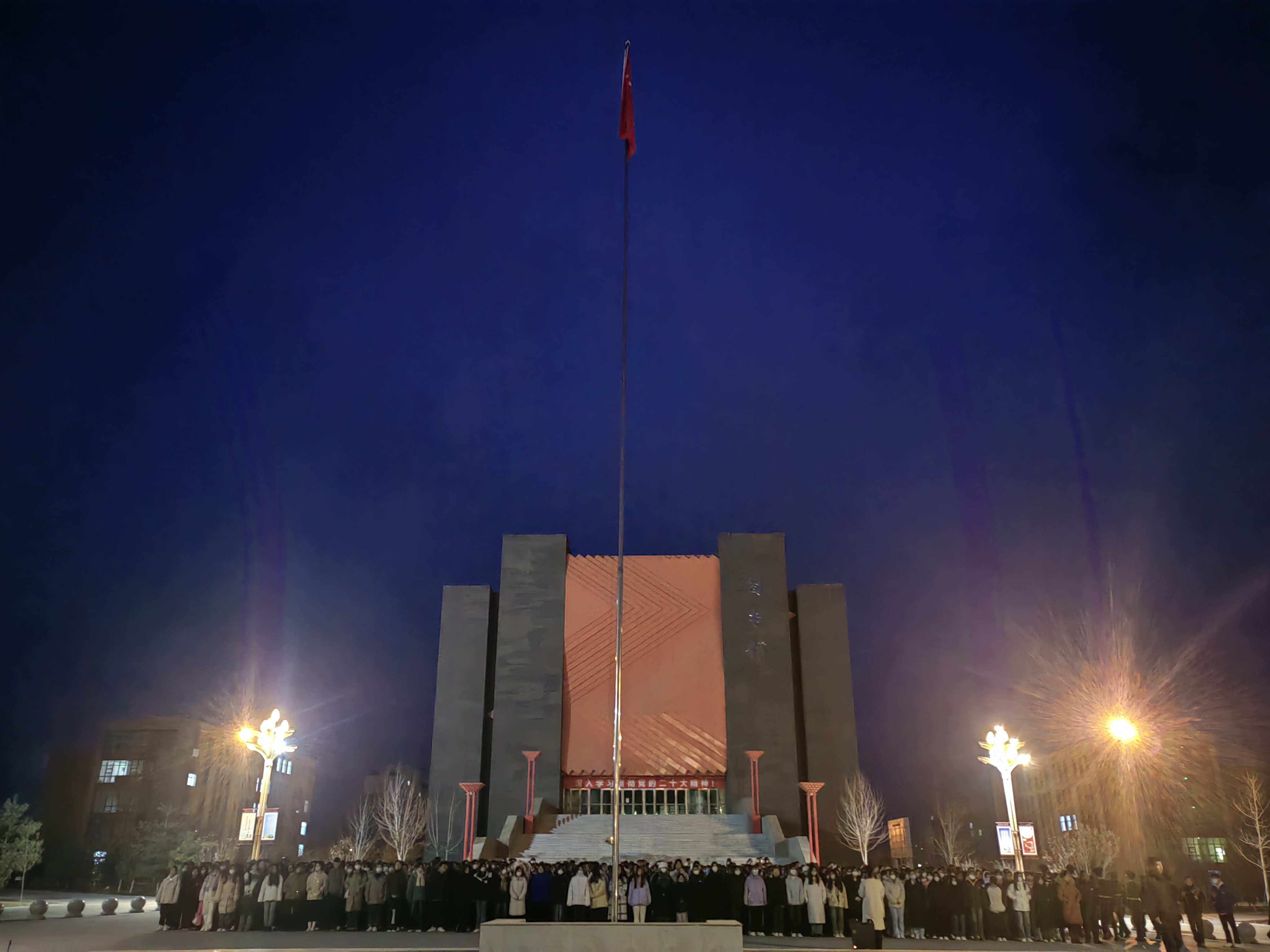 天色微明,國旗護(hù)衛(wèi)隊(duì)昂首挺胸,邁著鏗鏘有力的步伐護(hù)送國旗緩緩走向旗臺,全體師生肅然而立,行注目禮,伴隨著莊嚴(yán)的《中華人民共和國國歌》,五星紅旗在慷慨激昂的國歌聲中冉冉升起。