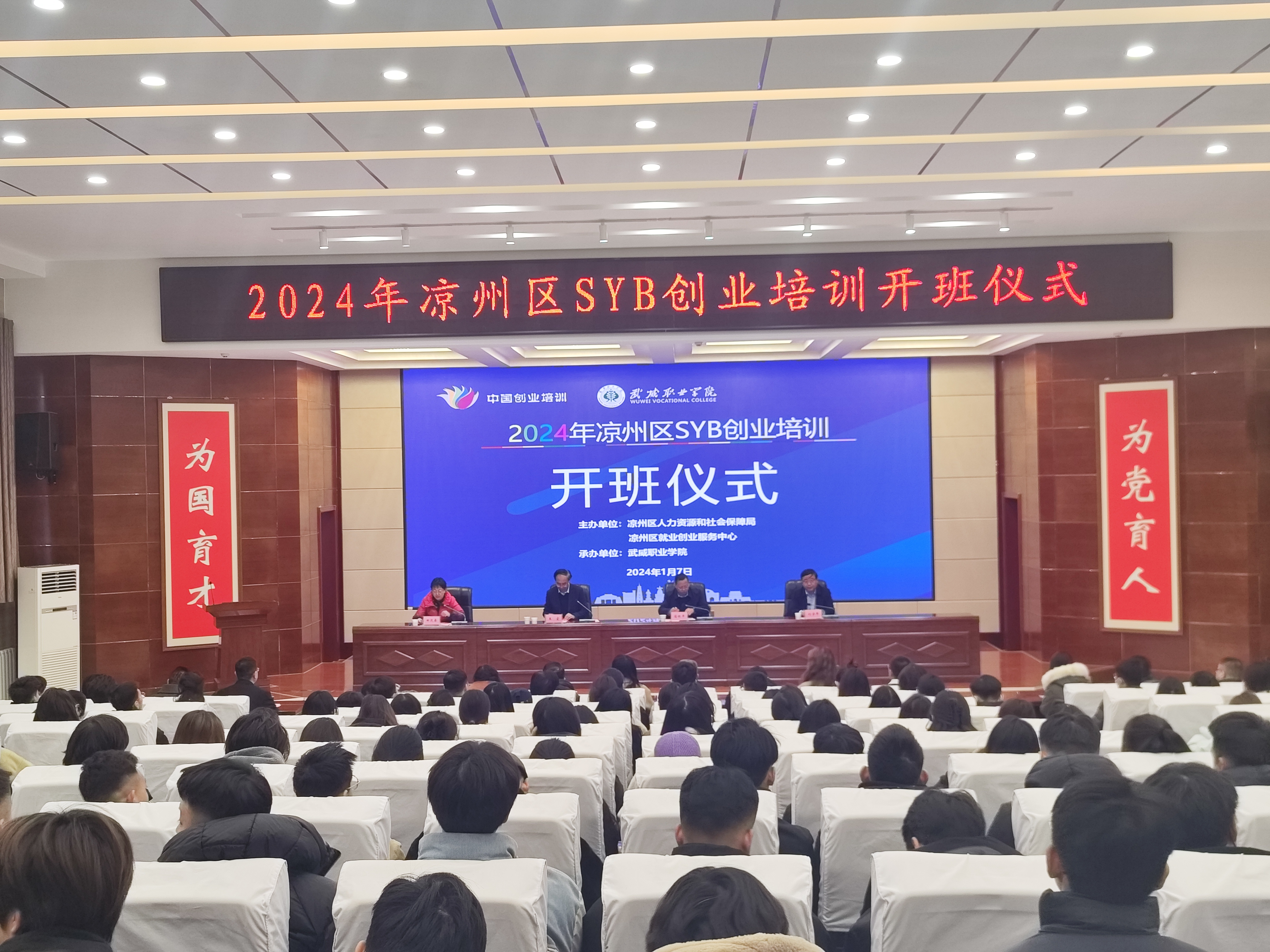 1月7日上午,由涼州區(qū)人社局、涼州區(qū)就業(yè)創(chuàng)業(yè)服務(wù)中心主辦,我校承辦的2024年涼州區(qū)SYB創(chuàng)業(yè)培訓(xùn)開班式在菁英廳舉行,學(xué)校黨委書記王宏,涼州區(qū)人社局黨組書記、局長(zhǎng)藺銀平,涼州區(qū)人社局黨組成員、區(qū)就業(yè)創(chuàng)業(yè)服務(wù)中心主任劉學(xué)年,學(xué)校繼續(xù)教育學(xué)院、創(chuàng)新創(chuàng)業(yè)中心負(fù)責(zé)同志參加開班式,學(xué)校黨委委員、副校長(zhǎng)田迎春主持開班式。培訓(xùn)講師代表,培訓(xùn)班班主任,培訓(xùn)學(xué)員代表等200余人參加了開班式。