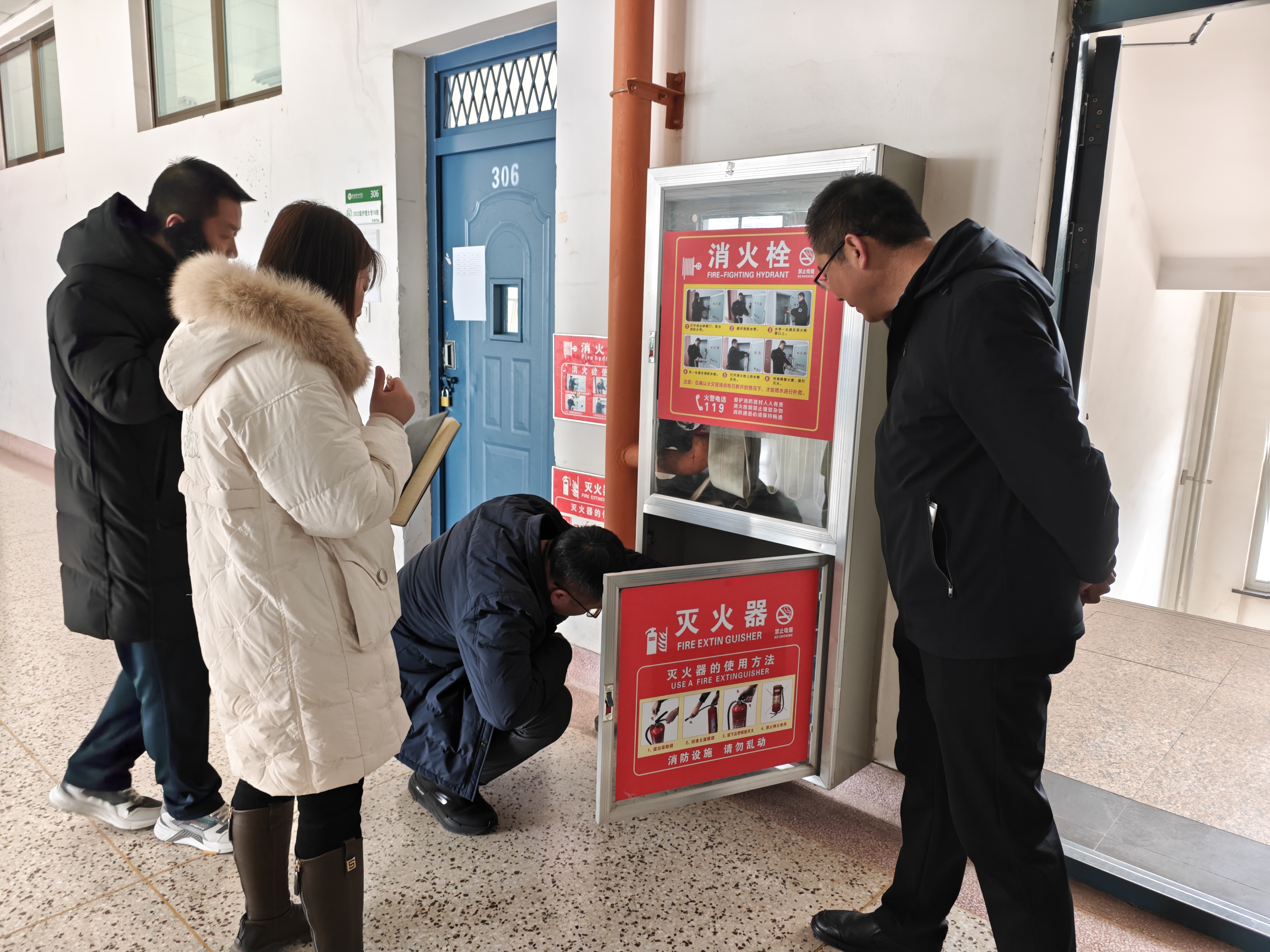 在實(shí)驗(yàn)實(shí)訓(xùn)室內(nèi),督察組詢問設(shè)施設(shè)備準(zhǔn)備情況,逐一檢查實(shí)訓(xùn)場地內(nèi)消防安全設(shè)施配備情況。