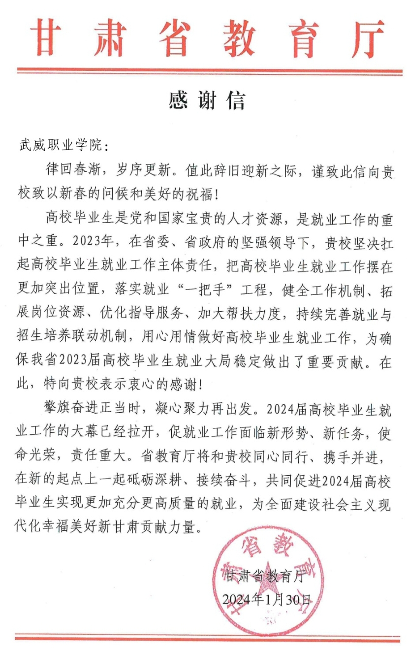 這些感謝信是對學校畢業(yè)生就業(yè)工作的肯定,也是激勵學校奮步前行的動力。學校將繼續(xù)在甘肅省教育廳的指導下,在與社會各界的通力合作下,一起砥礪深耕、接續(xù)奮斗,共同促進2024屆高校畢業(yè)生實現(xiàn)更加充分更高質(zhì)量的就業(yè)。