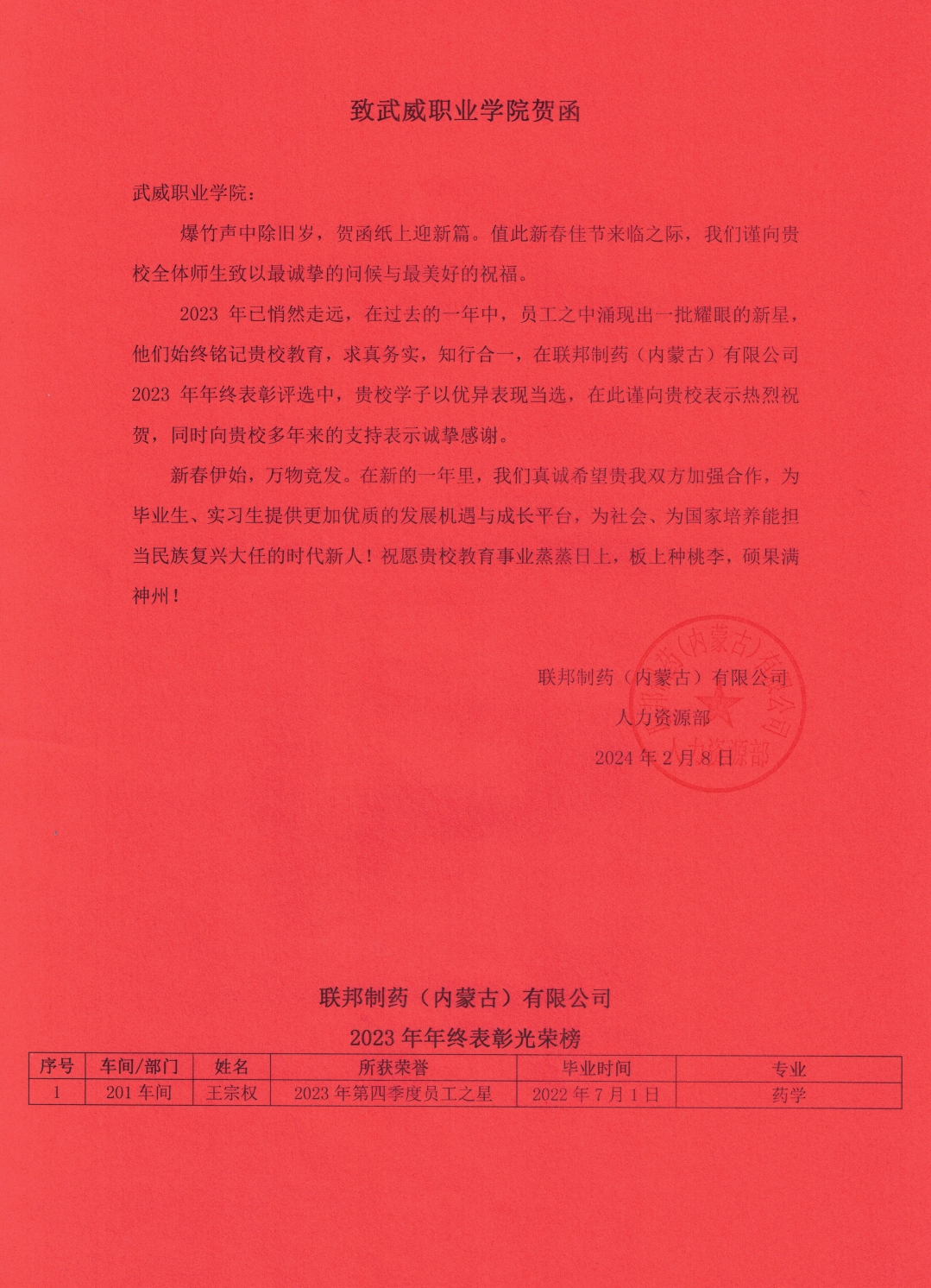 2月初,聯(lián)邦制藥(內(nèi)蒙古)有限公司向?qū)W校發(fā)來賀信,在信中感謝學校輸送眾多優(yōu)秀畢業(yè)生,表彰畢業(yè)生在工作中取得的優(yōu)異成績。其中,2022屆畢業(yè)生王宗權(quán)榮獲企業(yè)2023年第四季度員工之星。此外,聯(lián)邦制藥(內(nèi)蒙古)有限公司表示愿與學校繼續(xù)加強校企合作,共同為畢業(yè)生提供更加優(yōu)質(zhì)的發(fā)展機遇與成長平臺,為社會、為國家培養(yǎng)能擔當民族復興大任的時代新人!