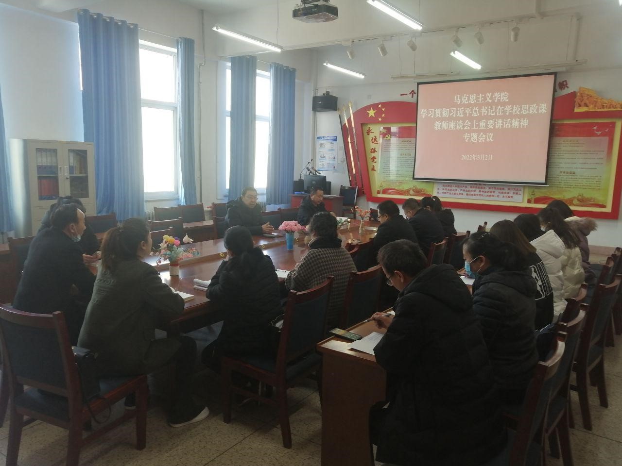 2022年正值習(xí)近平總書(shū)記3.18重要講話(huà)三周年,為貫徹落實(shí)學(xué)院黨委《關(guān)于做好習(xí)近平總書(shū)記在學(xué)校思政課教師座談會(huì)上重要講話(huà)精神貫徹落實(shí)情況全面總結(jié)宣傳工作的通知》精神,3月2日下午,馬克思主義學(xué)院在勵(lì)勤樓209會(huì)議室,召開(kāi)學(xué)習(xí)貫徹習(xí)近平總書(shū)記在學(xué)校思政課教師座談會(huì)上重要講話(huà)精神學(xué)習(xí)總結(jié)備課會(huì)暨2021-2022學(xué)年第2學(xué)期《毛澤東思想和中國(guó)特色社會(huì)主義理論體系概論》課程教學(xué)集體備課會(huì),會(huì)議由馬克思主義學(xué)院院長(zhǎng)胡靜峰主持,全體專(zhuān)兼職思政課教師參加了會(huì)議。