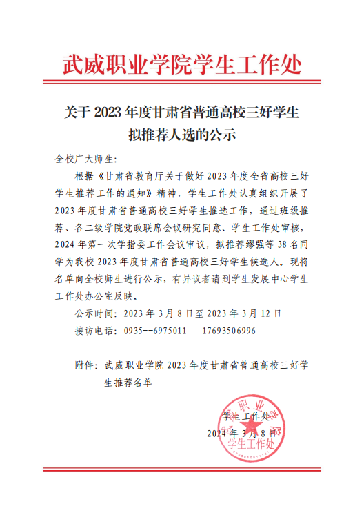 關于2023年度甘肅省普通高校三好學生擬推薦人選的公示