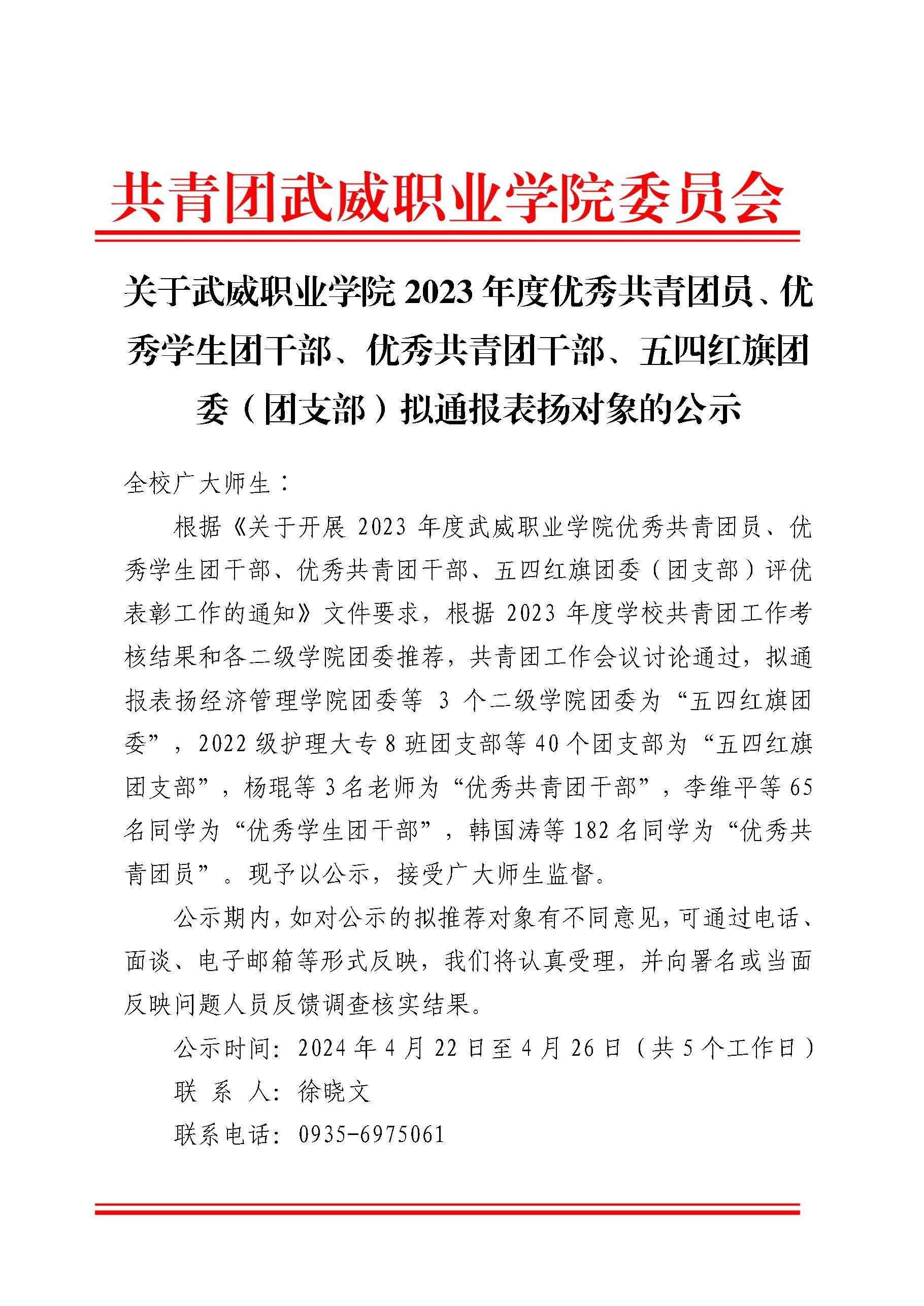 關(guān)于武威職業(yè)學(xué)院2023年度優(yōu)秀共青團(tuán)員、優(yōu)秀學(xué)生團(tuán)干部、優(yōu)秀共青團(tuán)干部、五四紅旗團(tuán)委(團(tuán)支部)擬通報(bào)表揚(yáng)對(duì)象的公示