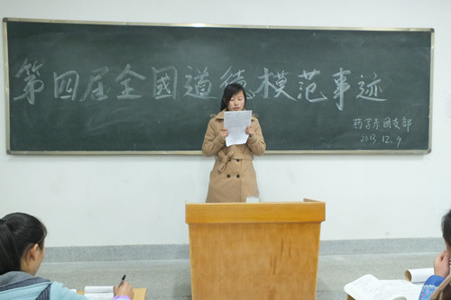 藥學系團總支于2013年12月9日組織全體同學深入學習了“第四屆全國道德模范事跡”,一個個動人的事跡印入耳畔,他們或充滿愛心、助人為樂,或見義勇為、舍身忘死,或敬老愛親、血脈情深。