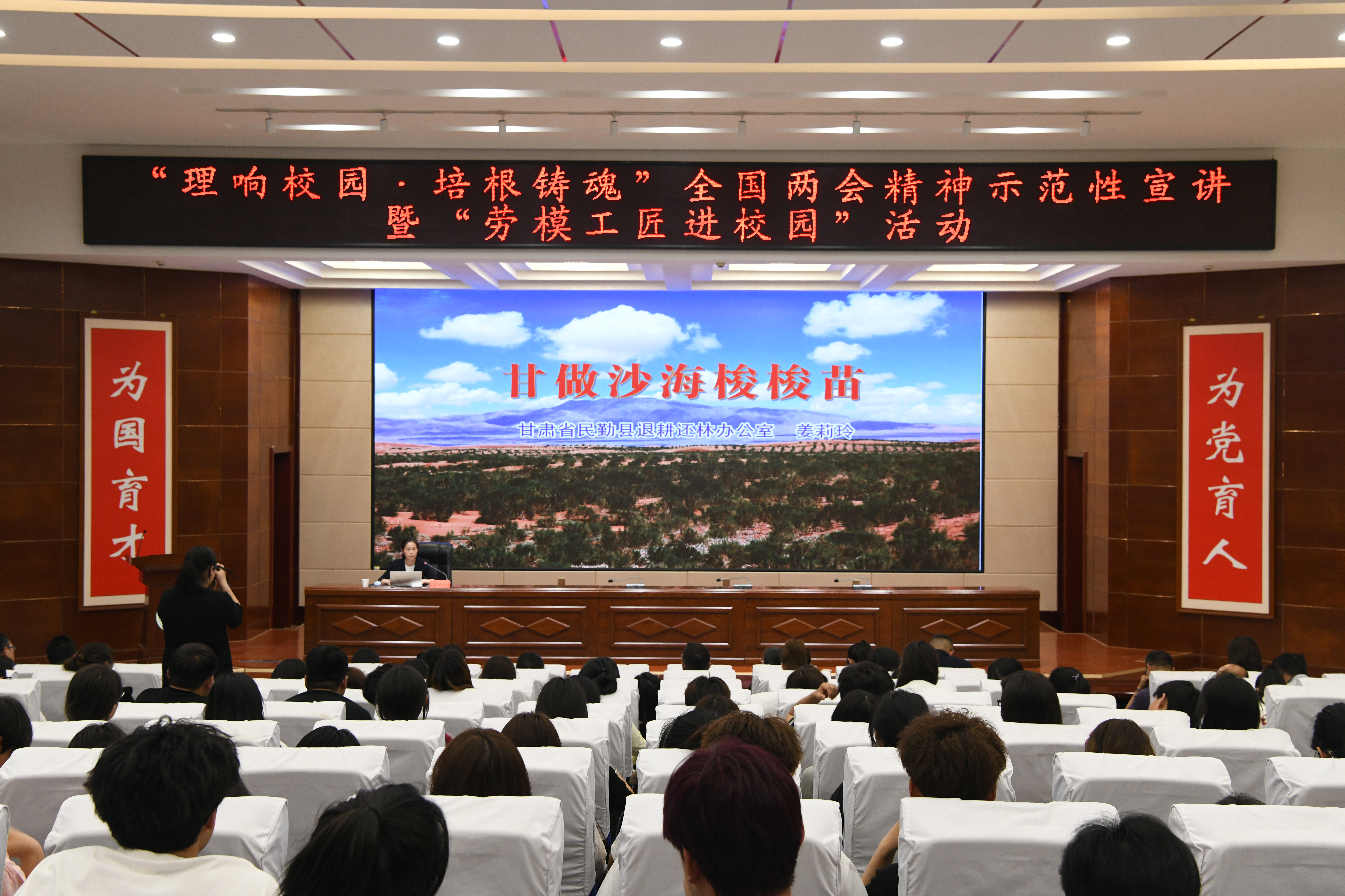 為全面深入學習領會習近平總書記在全國兩會期間發(fā)表的一系列重要講話精神以及全國兩會審議通過的報告和文件精神,根據(jù)省委教育工委、省總工會有關要求,5月20日上午,甘肅省“理響校園·培根鑄魂”全國兩會精神示范性宣講暨“勞模工匠進校園”活動武威職業(yè)學院專場,在學校學生發(fā)展中心菁英廳舉行。學校邀請?zhí)m州理工大學馬克思主義學院教授王海霞,武威民勤退耕還林辦公室主任、甘肅省五一巾幗獎章獲得者姜莉玲,蘭州理工大學經(jīng)管學院學生白玲玲來學校宣講。學校黨委委員、副校長何毅,宣傳統(tǒng)戰(zhàn)部負責人、師生代表共200余人參加宣講會。宣講會由何毅主持。