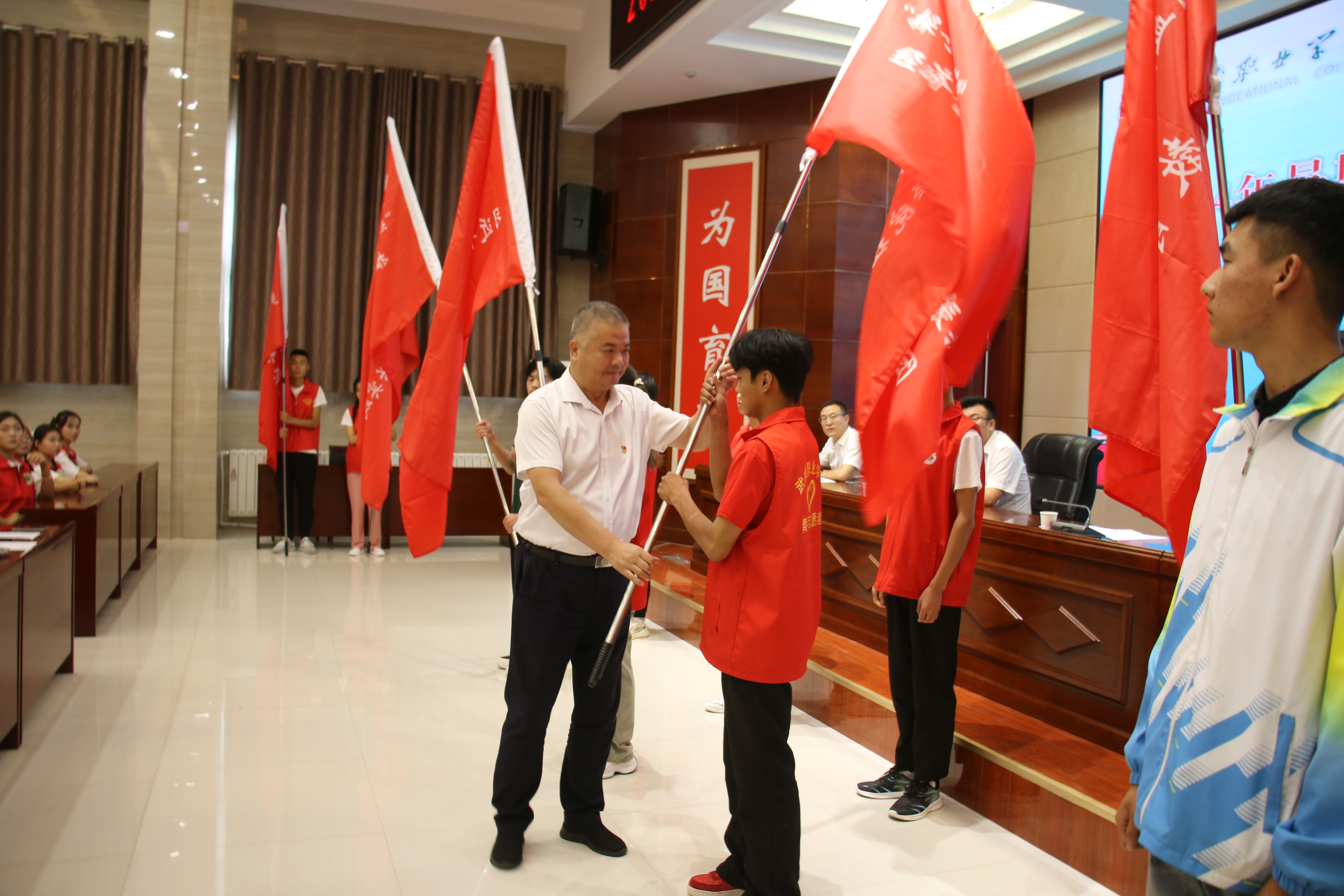 王守云為國家級和省級重點立項團隊授旗,并對即將啟程的實踐團隊提出三點希望和要求:一是要緊扣活動主題,在學思踐悟中筑牢信仰根基;二是積極探索實踐,在篤行實干中練就過硬本領;三是主動擔當作為,在踔厲奮發(fā)中展示武職風采。希望同學們向下扎根、向上生長,鍛煉自我的同時,筑牢“安全防線”,高質量開展本次社會實踐活動,收獲成長與進步,將“三下鄉(xiāng)”活動打造為我校形象展示的重要窗口和靚麗名片。