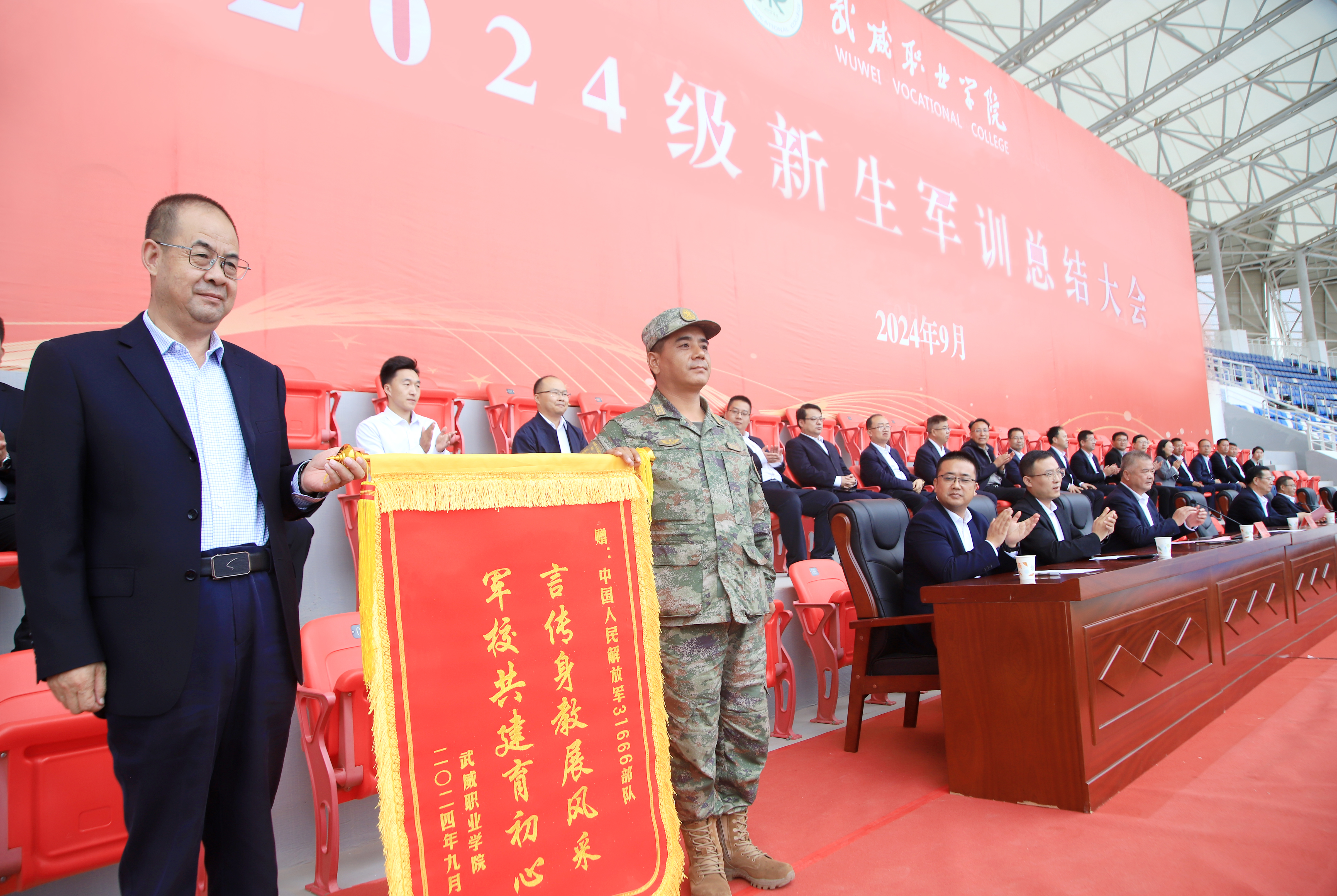 會上,翟存祥代表學(xué)校向承訓(xùn)部隊(duì)贈送錦旗致以崇高的敬意,向奮戰(zhàn)在訓(xùn)練一線的軍訓(xùn)教官及工作人員表示衷心的感謝!陳曉煜宣讀了2024級新生軍訓(xùn)工作先進(jìn)集體、先進(jìn)個(gè)人、優(yōu)秀教官和軍訓(xùn)標(biāo)兵擬表彰名單。與會領(lǐng)導(dǎo)為軍訓(xùn)先進(jìn)集體和個(gè)人頒發(fā)了獎牌和榮譽(yù)證書。