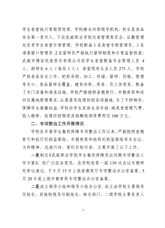 武威職業(yè)學院學生餐飲保障突出問題自查自糾工作總結