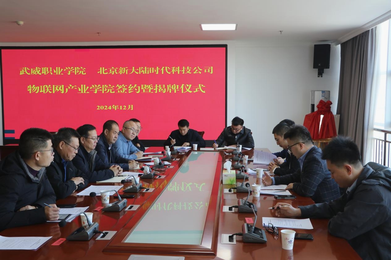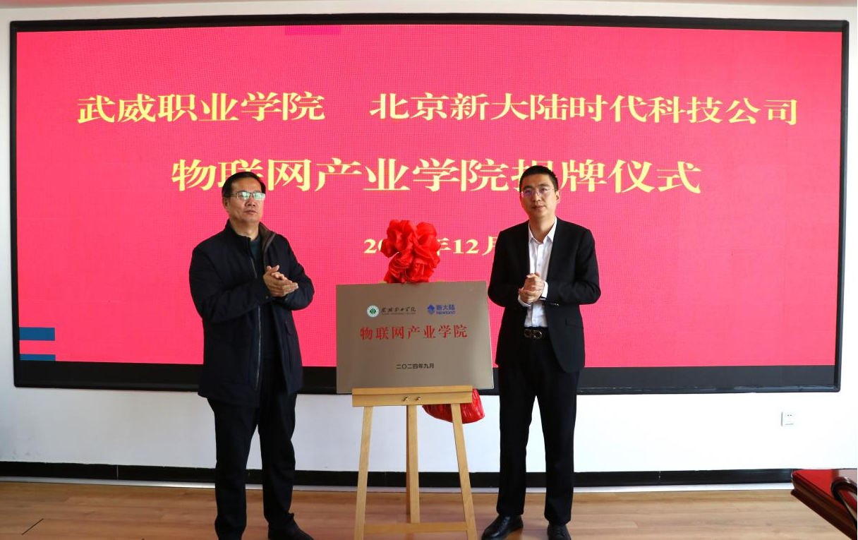為全面深化產(chǎn)教融合,加強校企合作,進一步提高我校人才培養(yǎng)質(zhì)量。12月3日,學校在能源科技樓811會議室舉行武威職業(yè)學院和北京新大陸時代科技公司物聯(lián)網(wǎng)產(chǎn)業(yè)學院簽約暨揭牌儀式。北京新大陸時代科技公司西北區(qū)總監(jiān)劉寧、技術(shù)總監(jiān)樊斌,相關(guān)業(yè)務部門負責人,學校校長、黨委副書記張開禮、黨委副書記翟存祥、相關(guān)部門負責人及教師代表參加活動。黨委委員、副校長王永緒主持儀式。