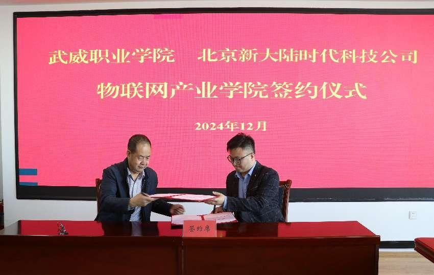 樊斌和翟存祥簽署《武威職業(yè)學院 北京新大陸時代科技公司產(chǎn)教融合合作協(xié)議》。