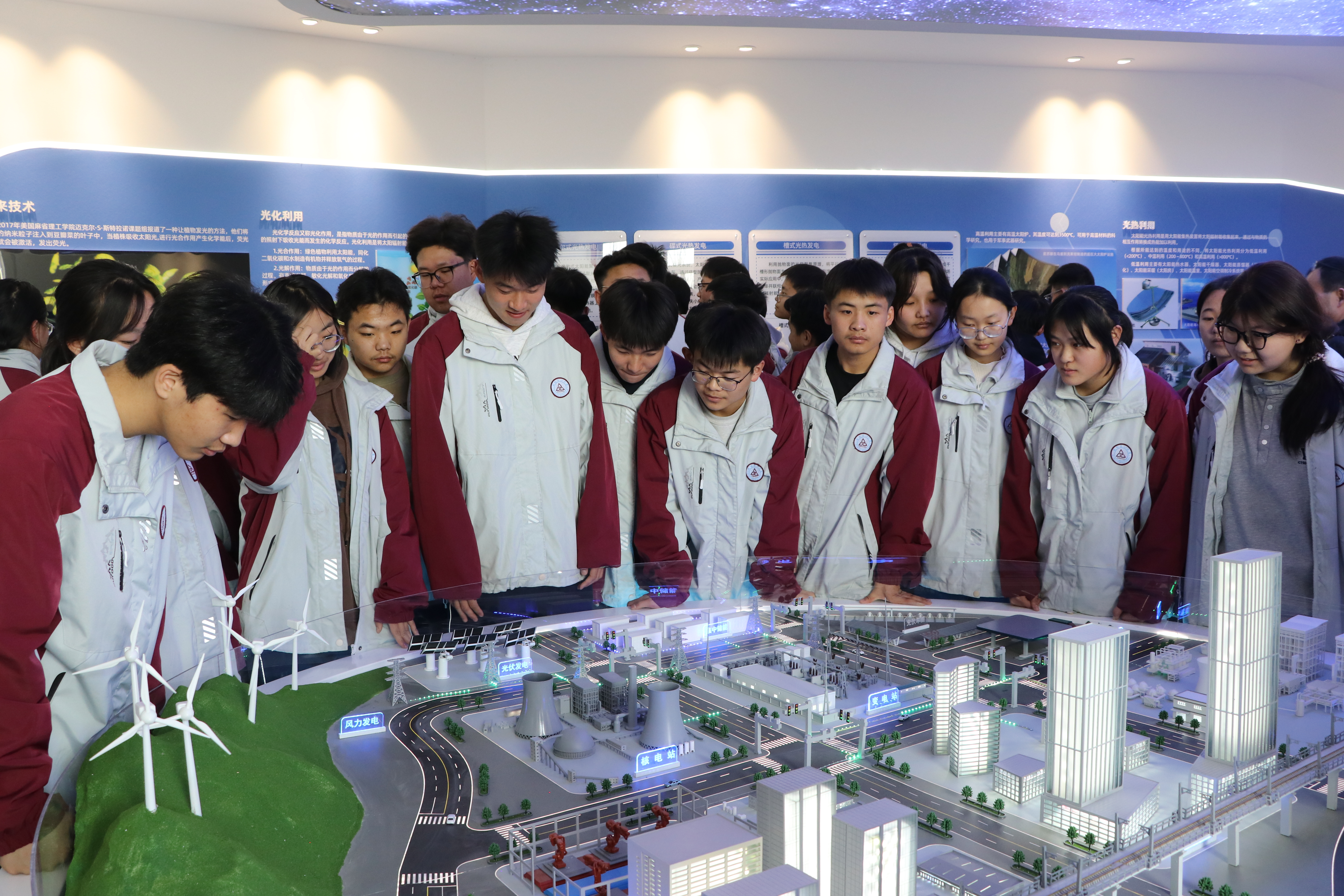 參觀活動(dòng)中,同學(xué)們興致勃勃的在“新能源科技館”中探索新能源的奧秘,體驗(yàn)參觀了光伏發(fā)電應(yīng)用、核能應(yīng)用、風(fēng)能應(yīng)用、氫能應(yīng)用等并觀看了多能互補(bǔ)沙盤演示。同學(xué)們?cè)诨顒?dòng)中觸摸科技,感受科技的無窮魅力,從而在心田播下科技之種,放飛科技成才夢(mèng)想。
