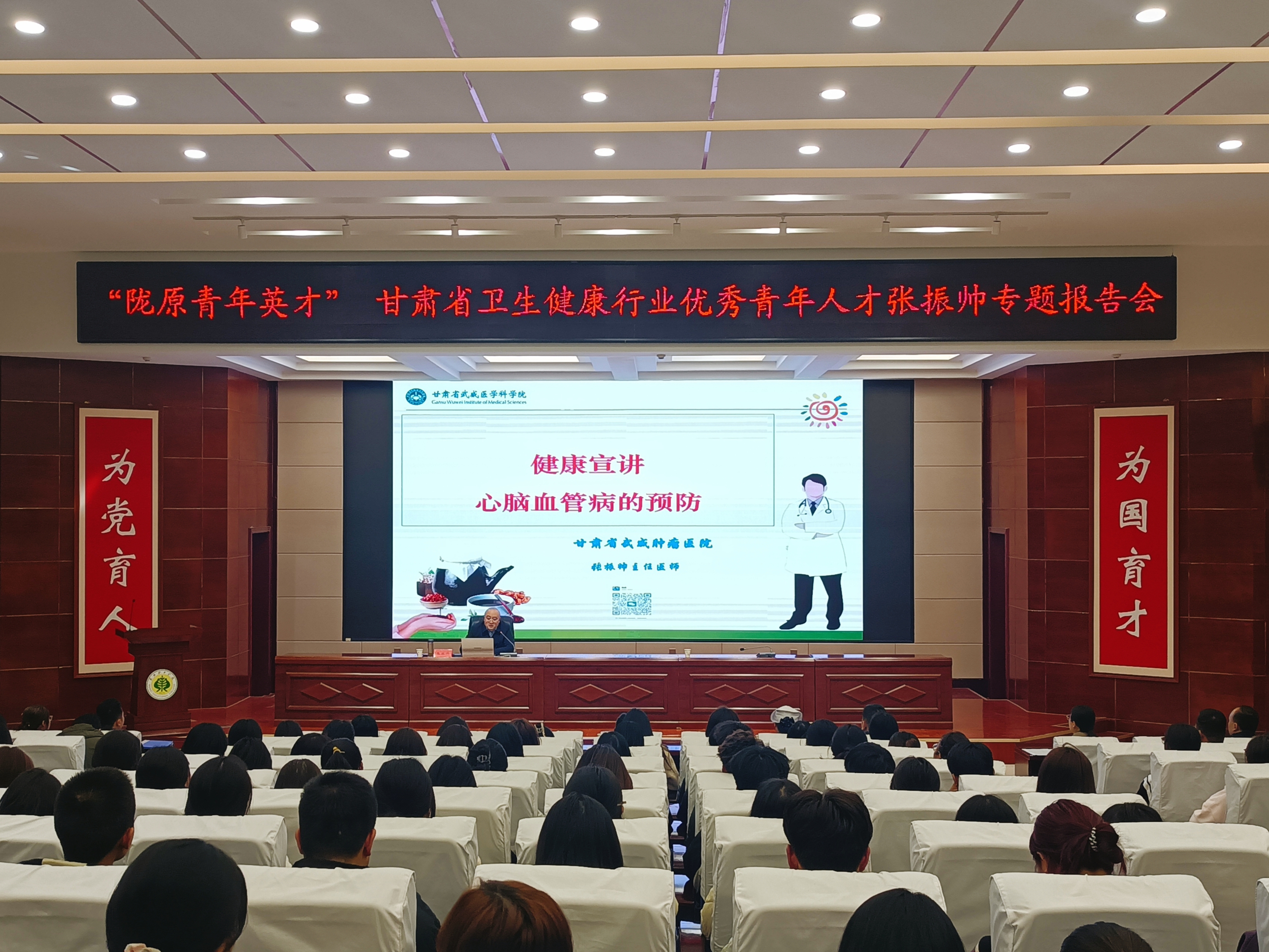 2月27日,學(xué)校邀請甘肅省武威腫瘤醫(yī)院張振帥主任醫(yī)師在學(xué)生發(fā)展中心菁英廳舉辦了中醫(yī)藥經(jīng)典誦讀活動與心腦血管疾病預(yù)防知識講座,護理學(xué)院學(xué)生團支部書記何玉桃等7名教師及2023級護理大專班全體學(xué)生共同參加。