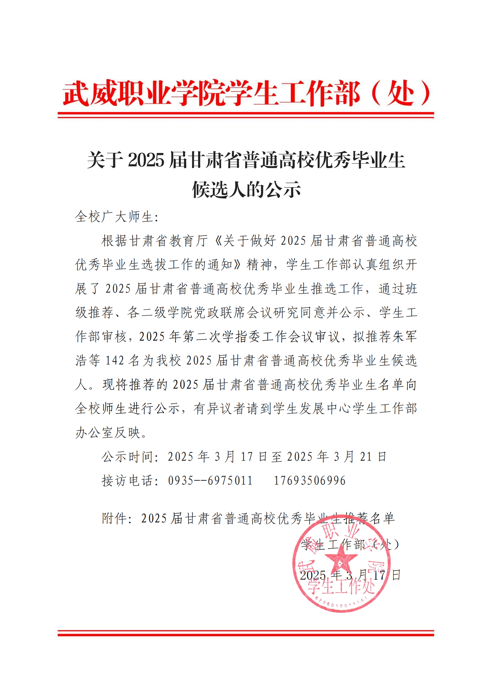 關(guān)于2025屆武威職業(yè)學(xué)院優(yōu)秀畢業(yè)生候選人的公示