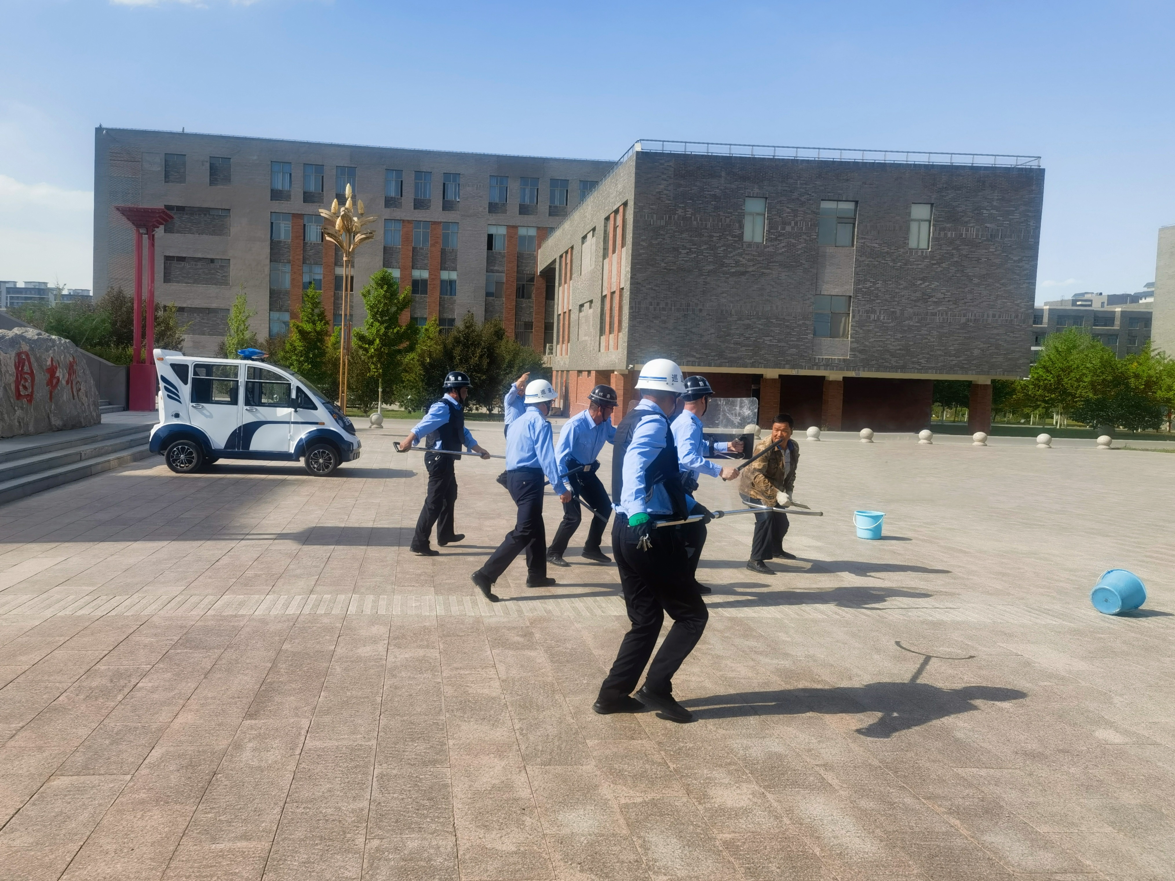 為進(jìn)一步增強(qiáng)師生反恐防暴意識(shí),提升安保人員應(yīng)急處置能力,筑牢校園安全防線,5月15日,學(xué)校安全保衛(wèi)處聯(lián)合轄區(qū)派出所在圖書館東側(cè)廣場(chǎng)組織開展了反恐防暴應(yīng)急演練。
