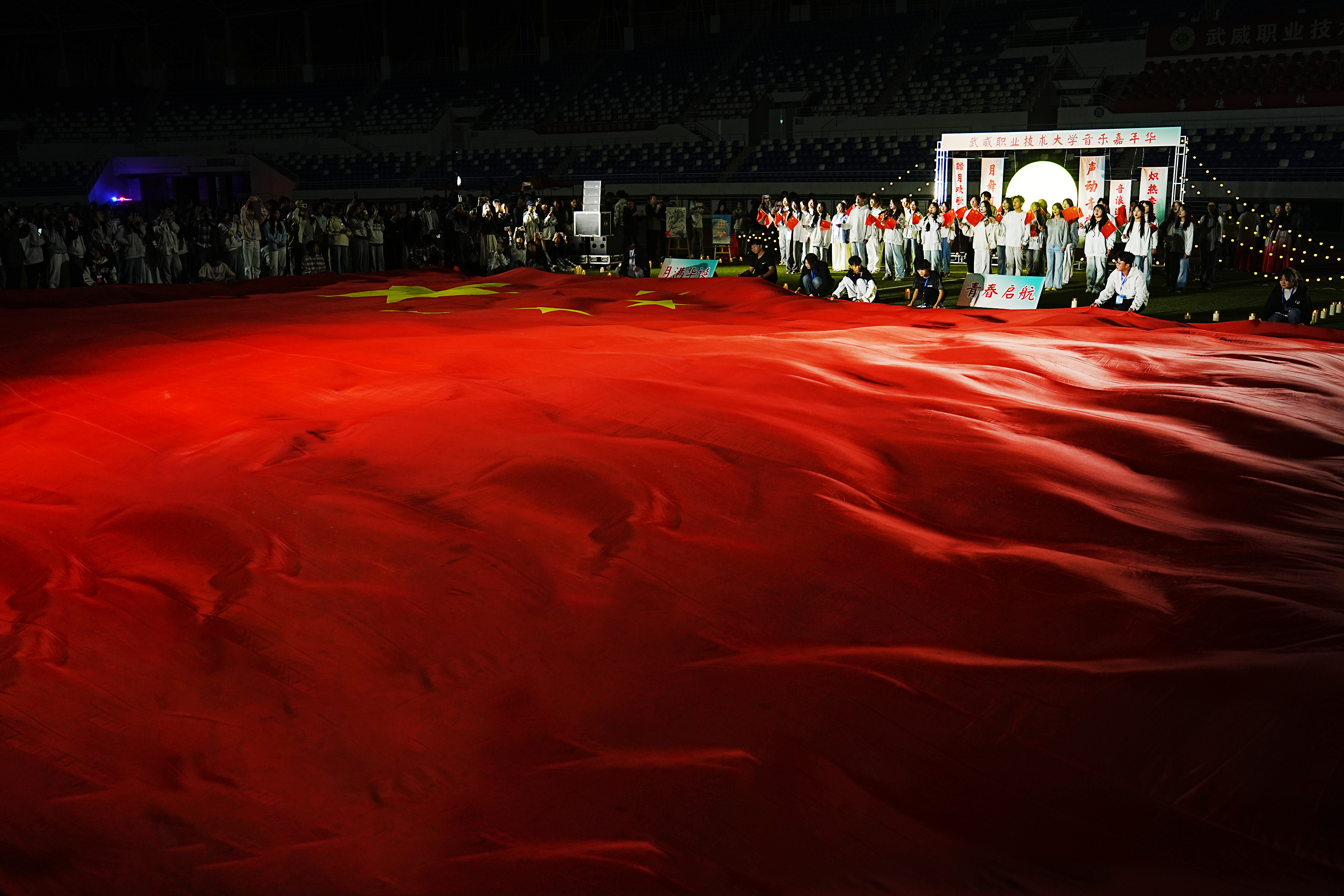 活動(dòng)尾聲,在深情的旋律中,演職人員與觀眾齊聲合唱《如愿》,深切表達(dá)對國泰民安的美好祝愿。巨幅國旗在師生手中緩緩傳遞、飄揚(yáng)舞動(dòng),匯成一片莊嚴(yán)而溫暖的紅色海洋,將現(xiàn)場氛圍推向最高潮,展現(xiàn)出青年一代與時(shí)代同頻、與祖國同行的堅(jiān)定信念。