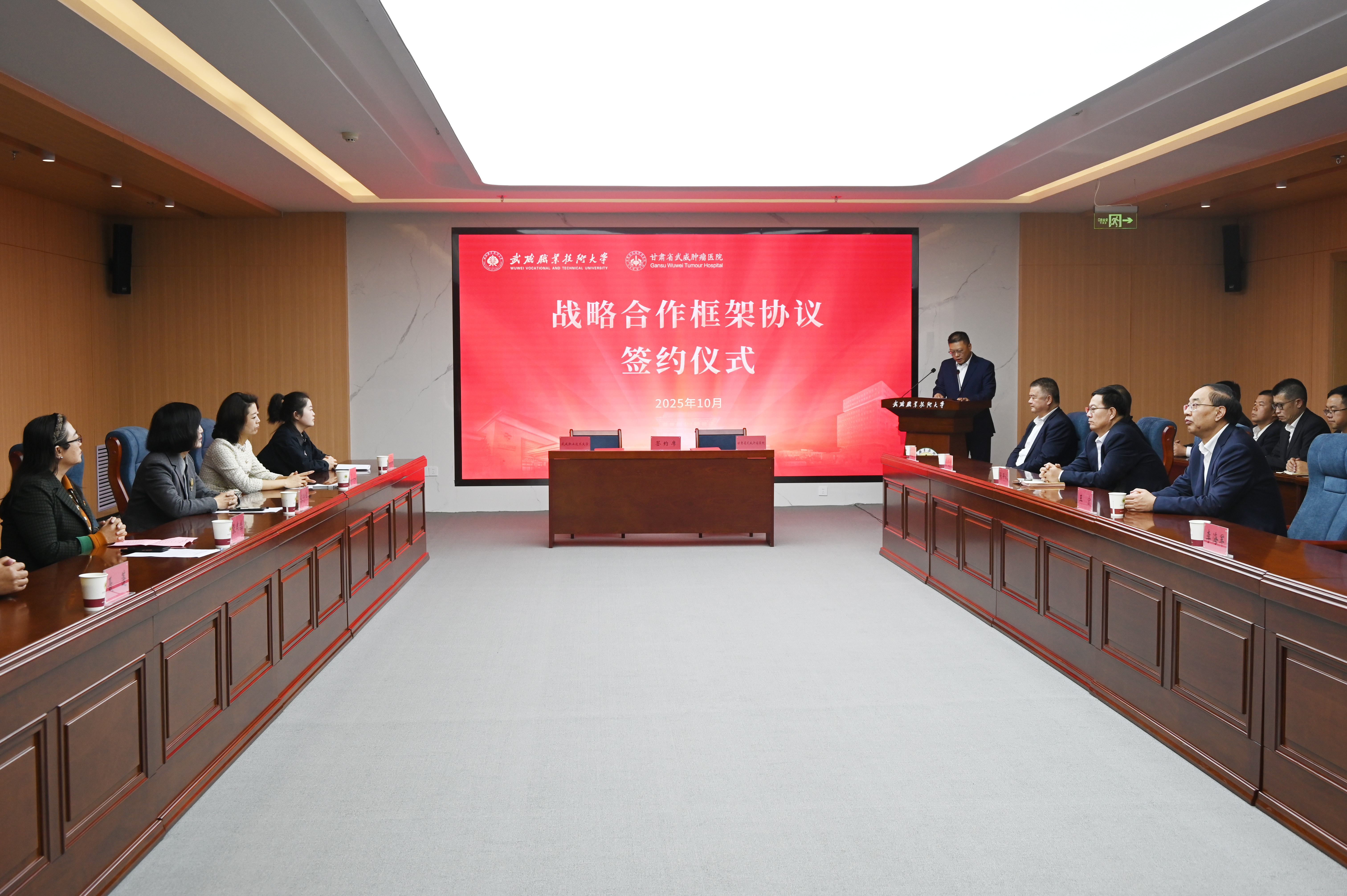 10月12日下午,武威職業(yè)技術大學與甘肅省武威腫瘤醫(yī)院舉行戰(zhàn)略合作框架協(xié)議簽約儀式,標志著雙方合作進入新階段。這是落實“健康中國”戰(zhàn)略、推動醫(yī)療與教育深度融合的重要舉措,將助力“健康甘肅”建設和武威市“兩擎牽引、五極迸發(fā)”發(fā)展格局。