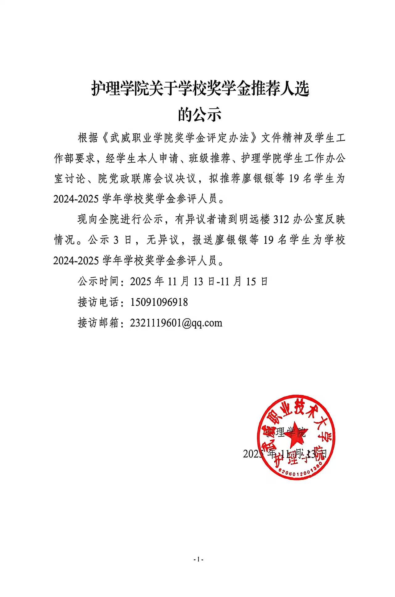 護理學院關于2025年獎補專項助學金推薦人選的公示