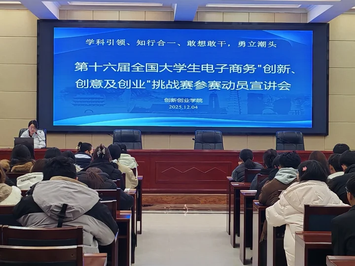 為積極備戰(zhàn)第十六屆全國(guó)大學(xué)生電子商務(wù)“創(chuàng)新、創(chuàng)意及創(chuàng)業(yè)”挑戰(zhàn)賽,激發(fā)學(xué)生參賽熱情,提升項(xiàng)目質(zhì)量,創(chuàng)新創(chuàng)業(yè)學(xué)院于12月4日在行樹樓北側(cè)報(bào)告廳舉行大賽動(dòng)員宣講會(huì)。來自全校9個(gè)學(xué)院的師生代表共計(jì)120人參加了本次動(dòng)員會(huì)。