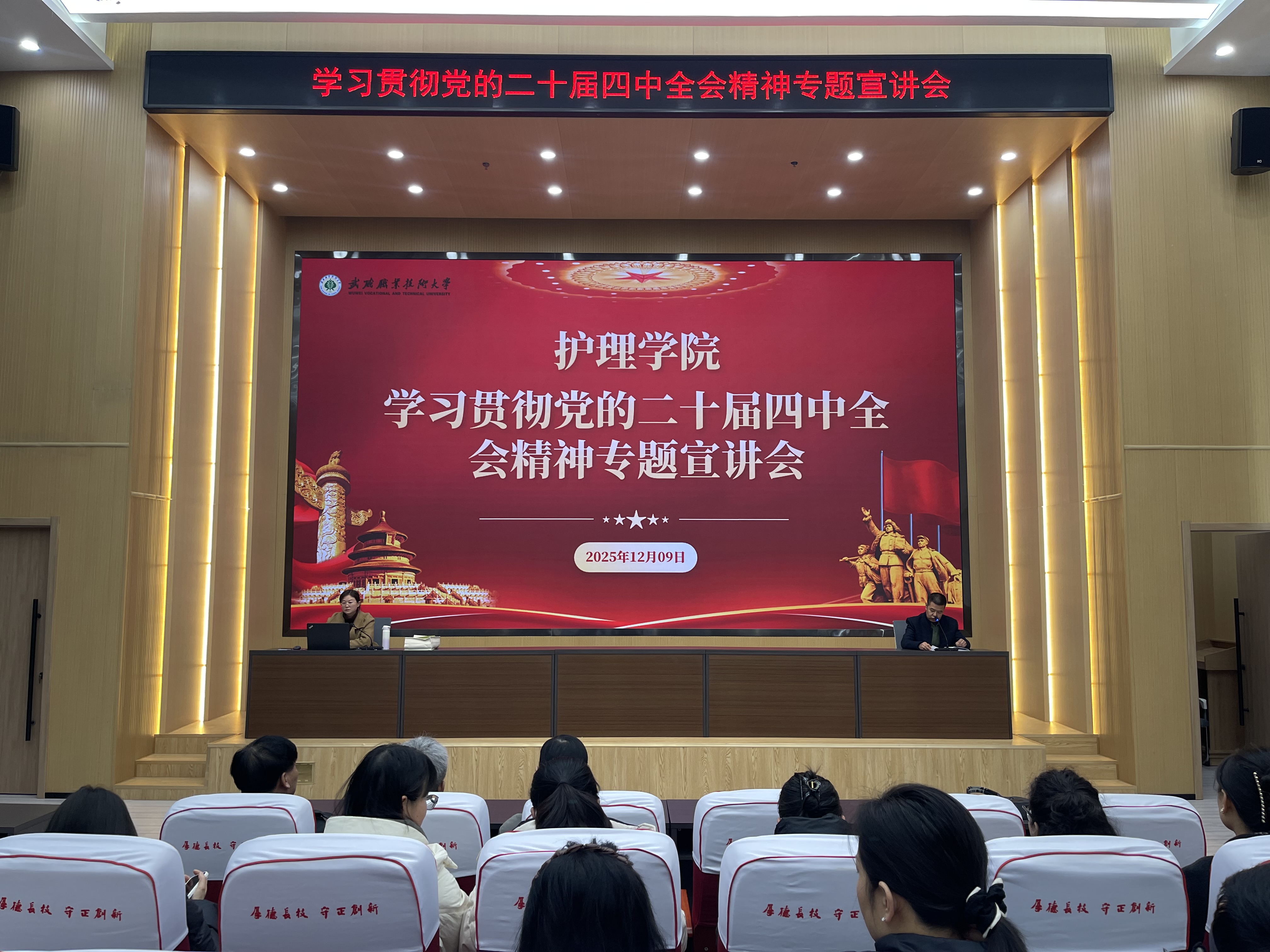 為深入學(xué)習(xí)宣傳貫徹黨的二十屆四中全會精神,切實把思想和行動統(tǒng)一到黨中央決策部署上來,根據(jù)學(xué)校黨委統(tǒng)一安排,12月9日,護理學(xué)院舉行了學(xué)習(xí)宣傳貫徹黨的二十屆四中全會精神專題宣講報告會。學(xué)校宣講組成員、馬克思主義學(xué)院教師杜曉娟應(yīng)邀做專題宣講。學(xué)院領(lǐng)導(dǎo)班子、全體教職工、預(yù)備黨員、入黨積極分子及班團干部共計100余人聆聽了報告會。報告會由學(xué)院黨總支書記藺生武主持。