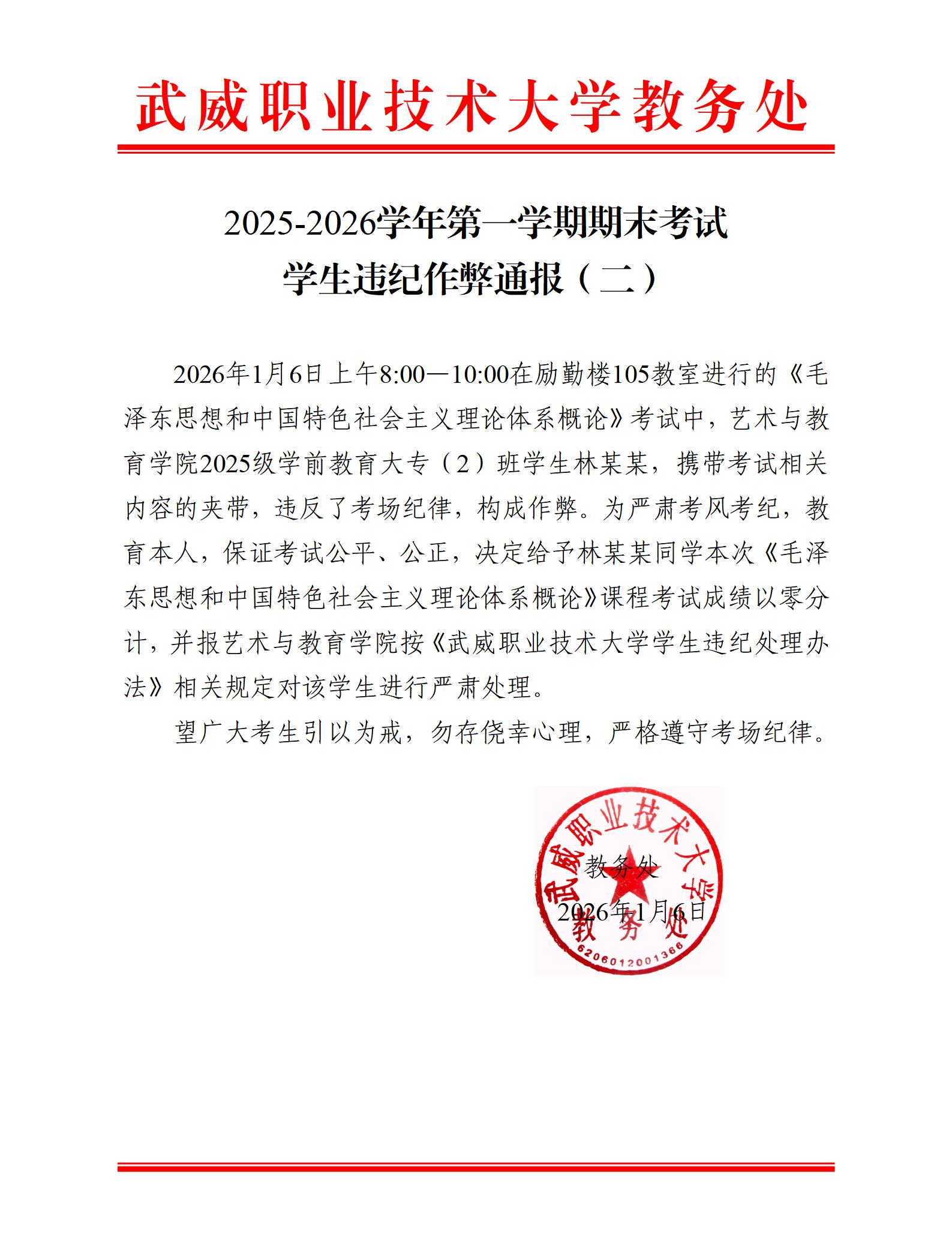 2025-2026學(xué)年第一學(xué)期期末考試學(xué)生違紀(jì)作弊通報(二)